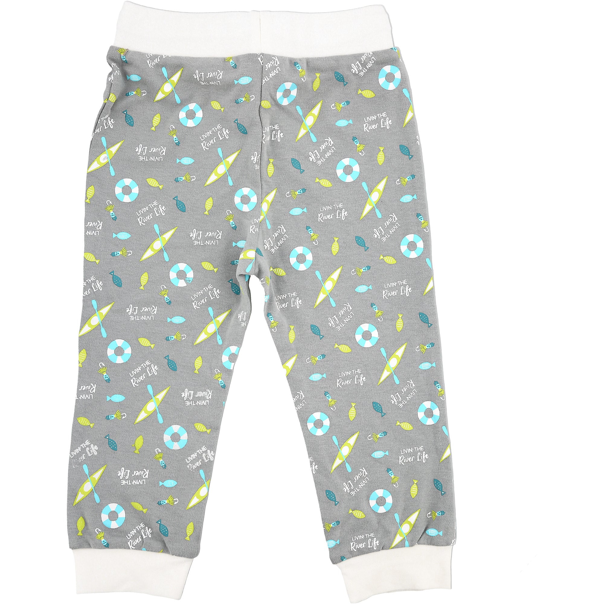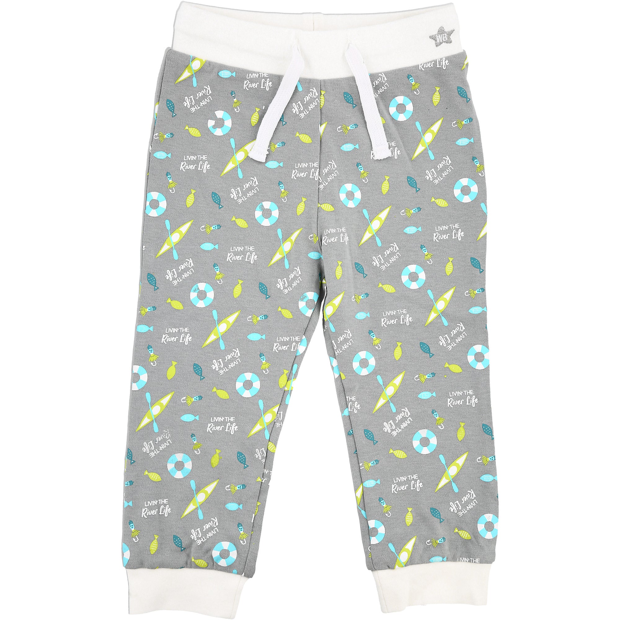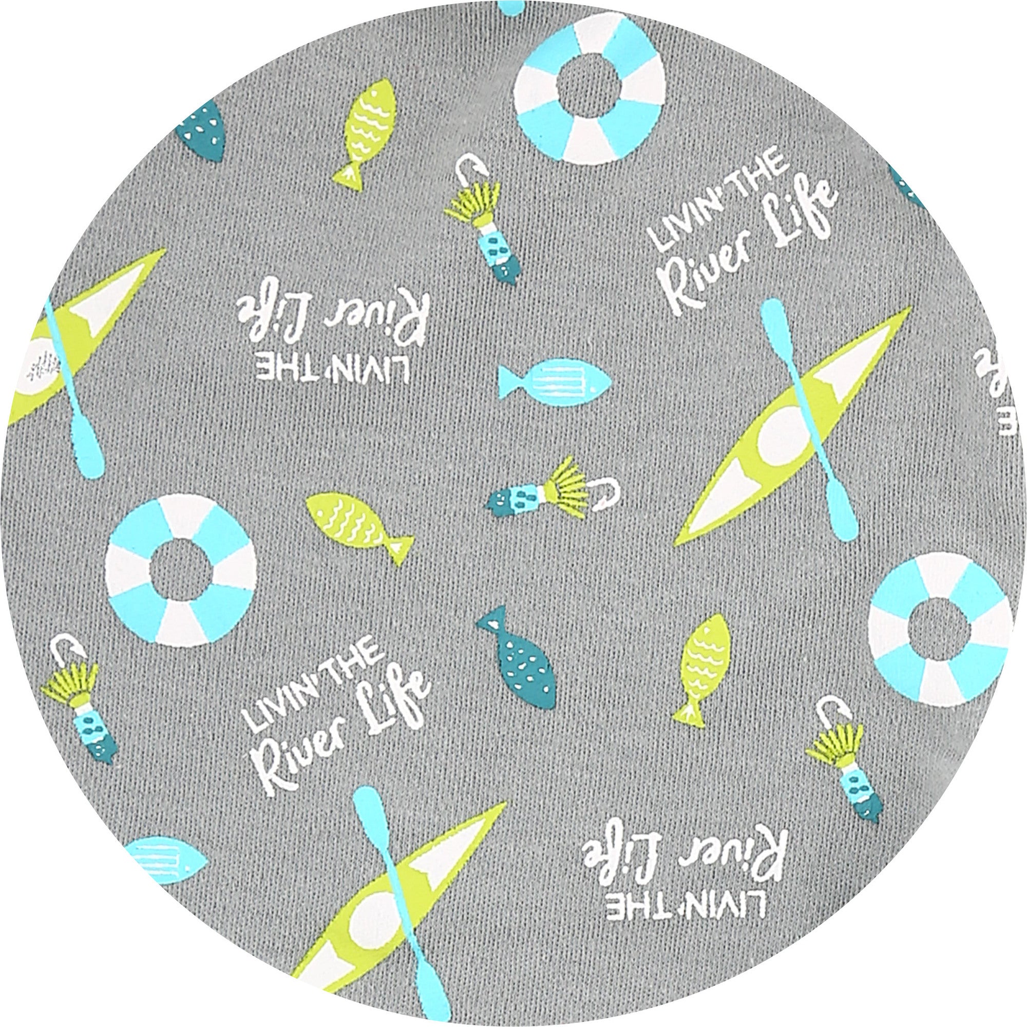 - IN-HOUSE DESIGN: The waistband has a star-shaped embroidered WB background. The green/teal fish, light blue/white lifesavers, fish hooks, and green kayak patterns accompany a repeating "Livin' The River Life" white sentiment.