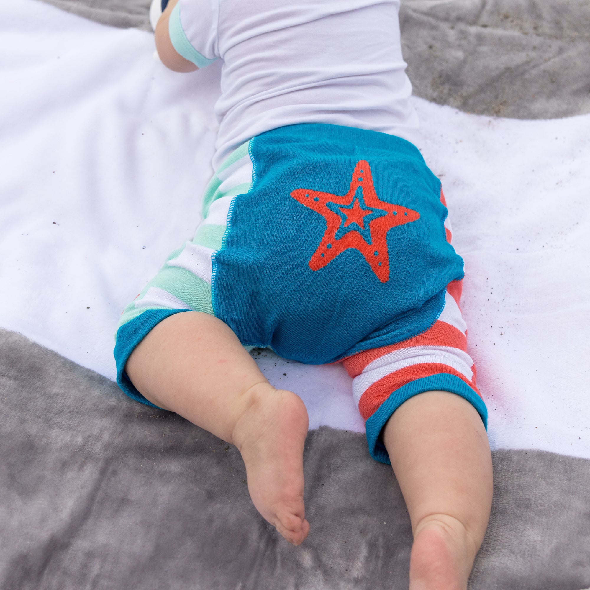 - N-HOUSE DESIGN: The waistband, bum, and over-the-knee trim are teal blue. One leg is white and aqua-blue striped; the other is coral and white striped on the backside. The front legs are a solid aqua blue and solid coral split down the middle. The backside features a large coral starfish; the front features the same starfish on a smaller scale.