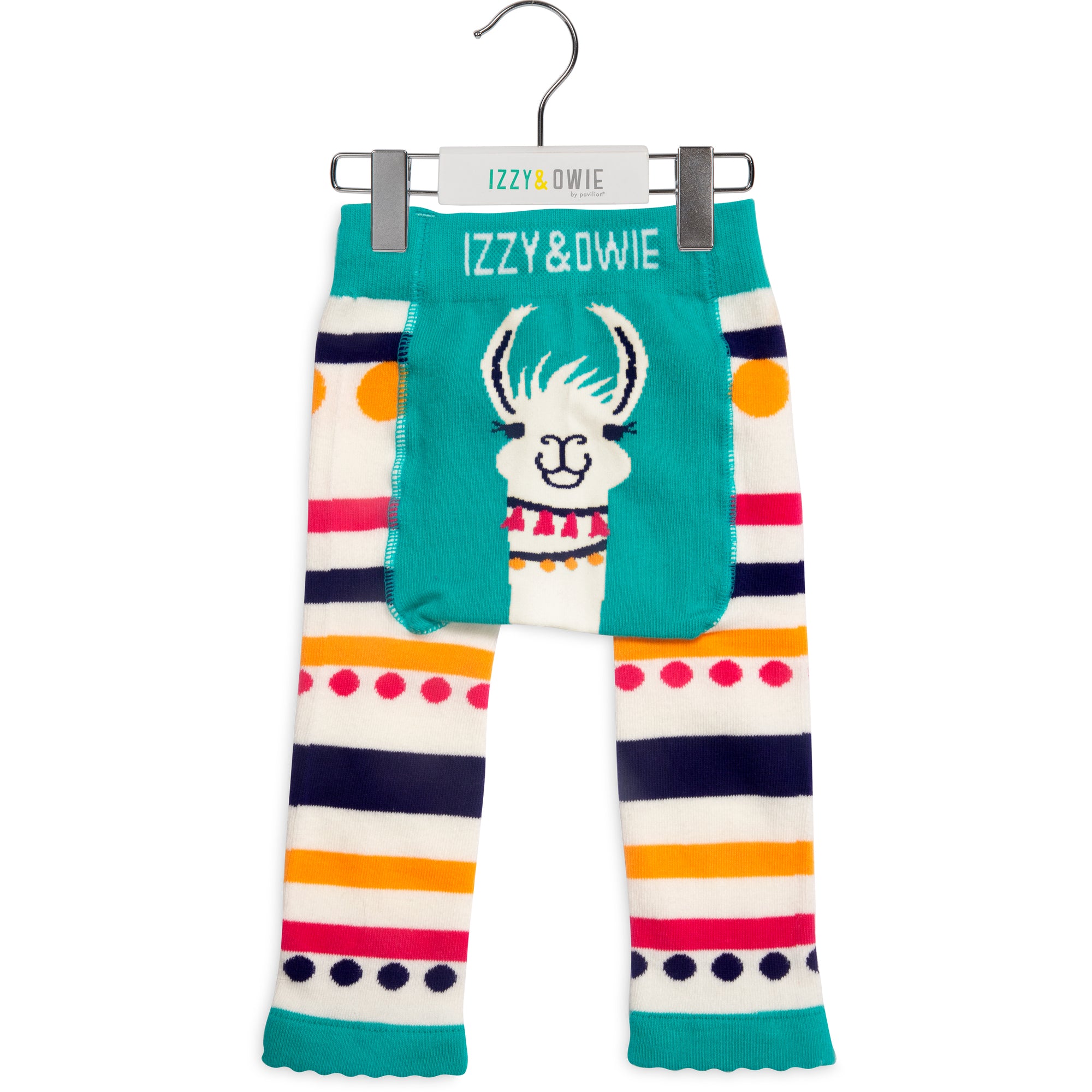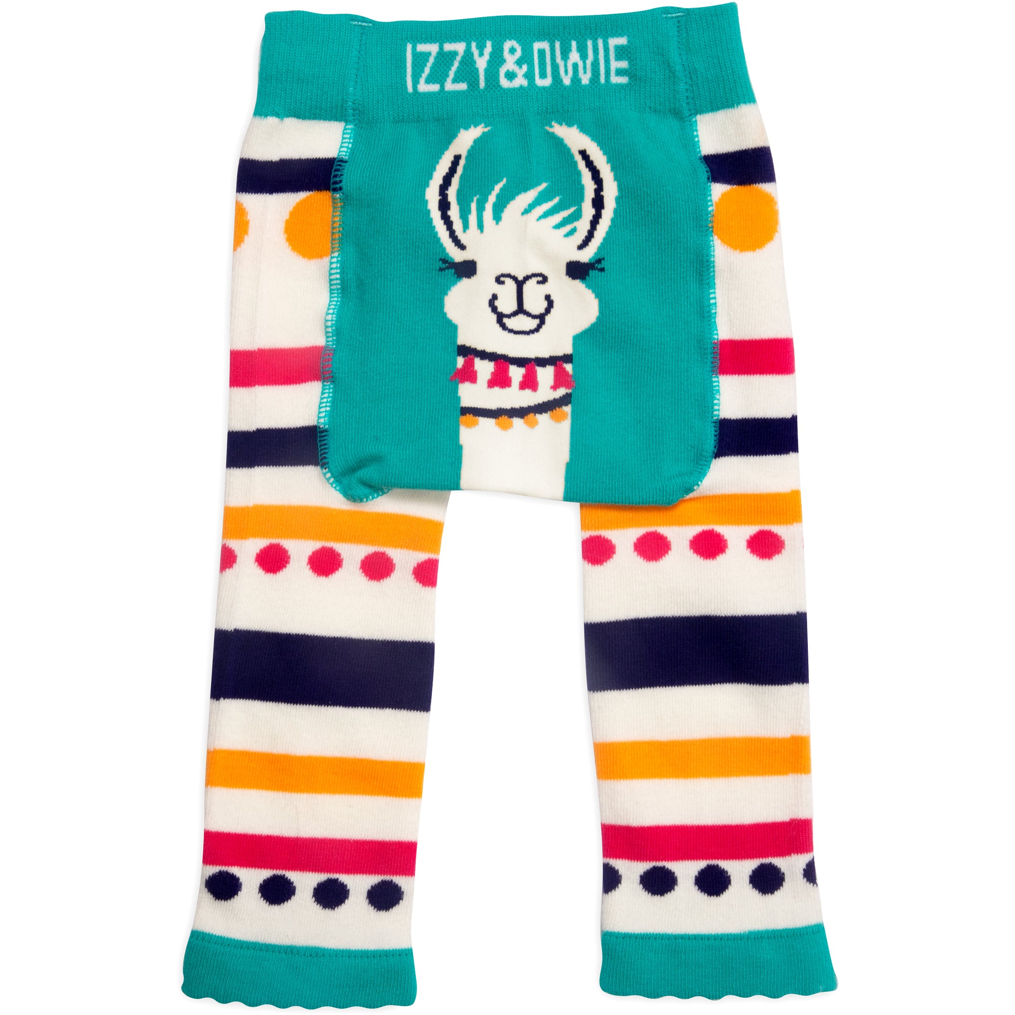 - IN-HOUSE DESIGN: "Izzy & Owie" text is sewn into the waistband, llama image is sewn into the rear, and the stripe and dot pattern of the main material covers the rest of the leggings.