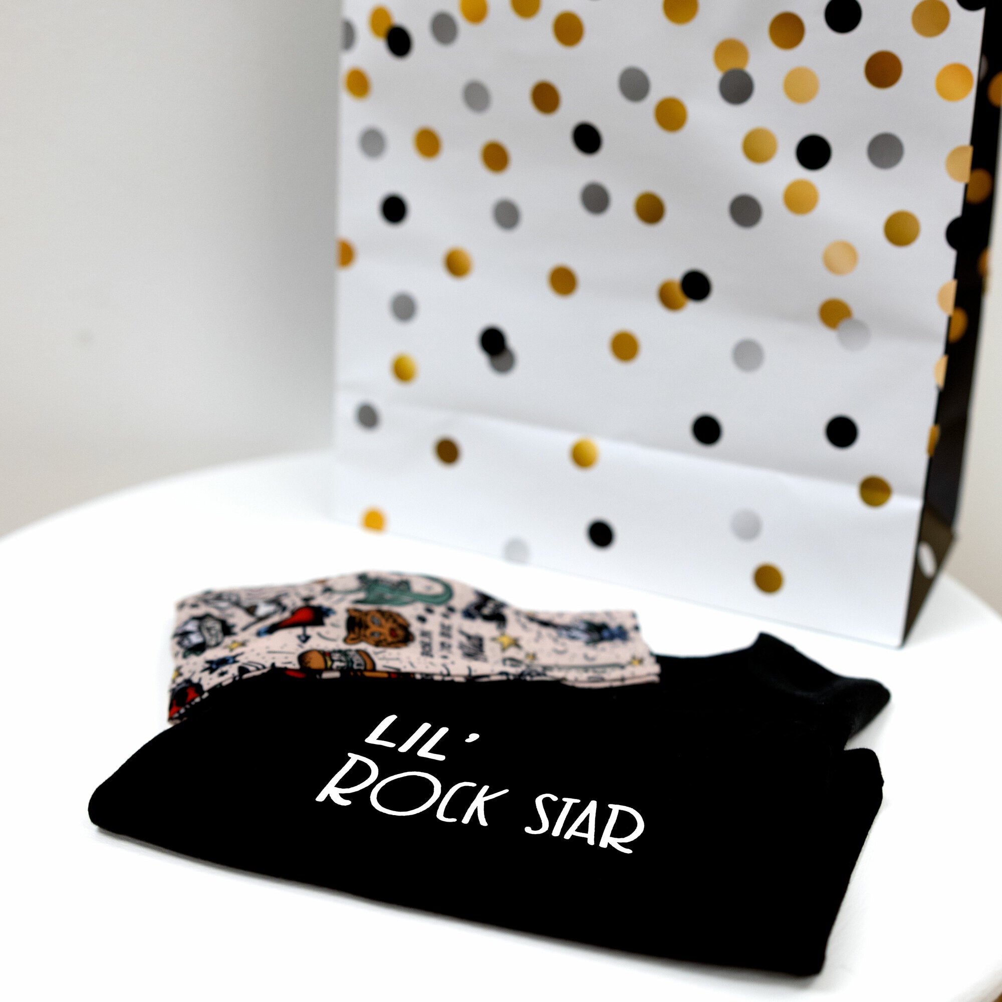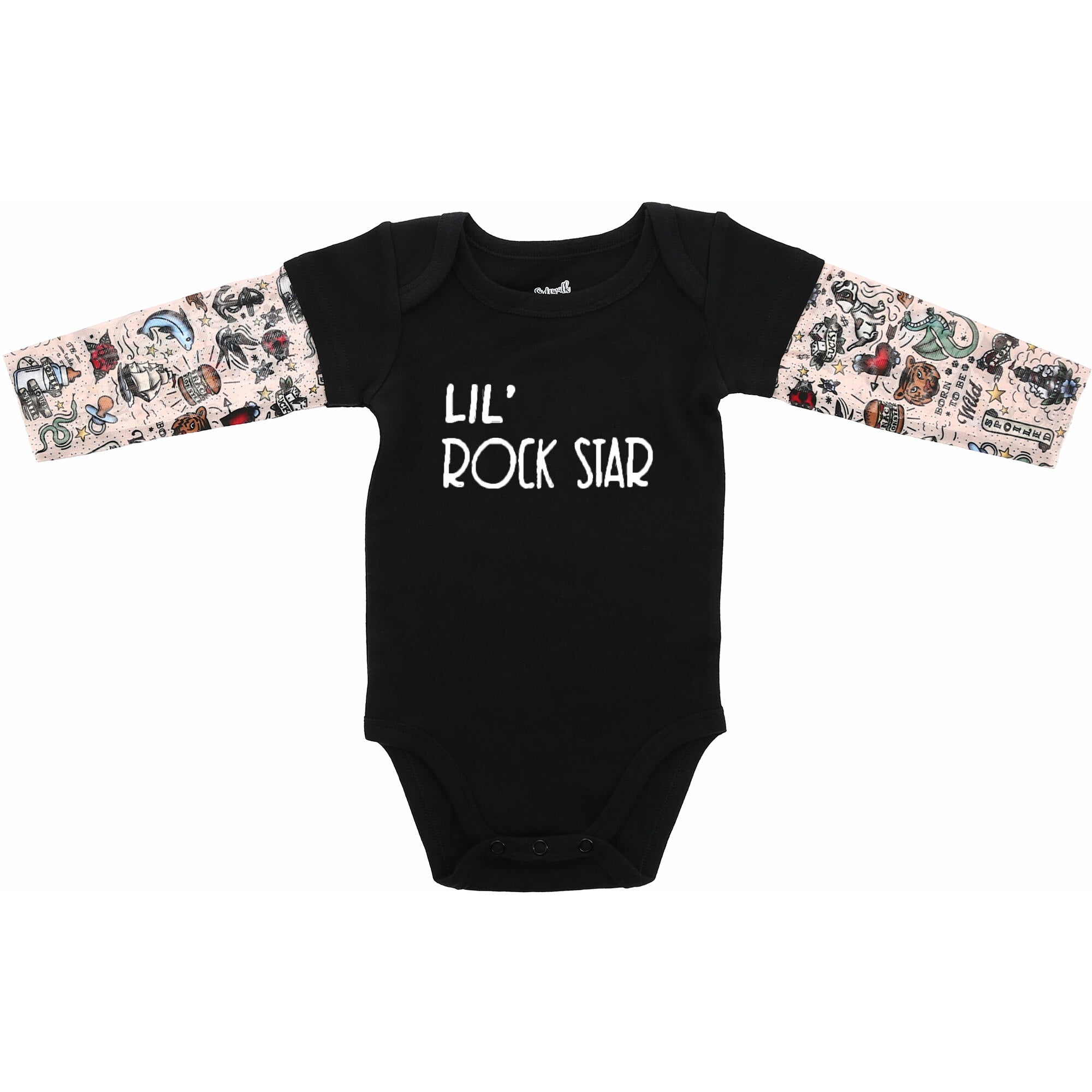 - IN-HOUSE DESIGN: The sleeves consist of new school-style inspired drawings, including puppies, pawprints, dice, hearts, stars, flowers, dragons, bottles, binkies, sailboats, waves, lighthouses, dolphins, tigers, birds, ladybugs, anchors, stars, snakes, polka dots, burgers, "Born To Be Wild," "Mom," "Spoiled," "I'll Take A Bottle Of House White," "Snack Monster," "Lucky," and more which all consist of the colors of the rainbow. The front chest center has a "Lil' Rock Star" sentiment.