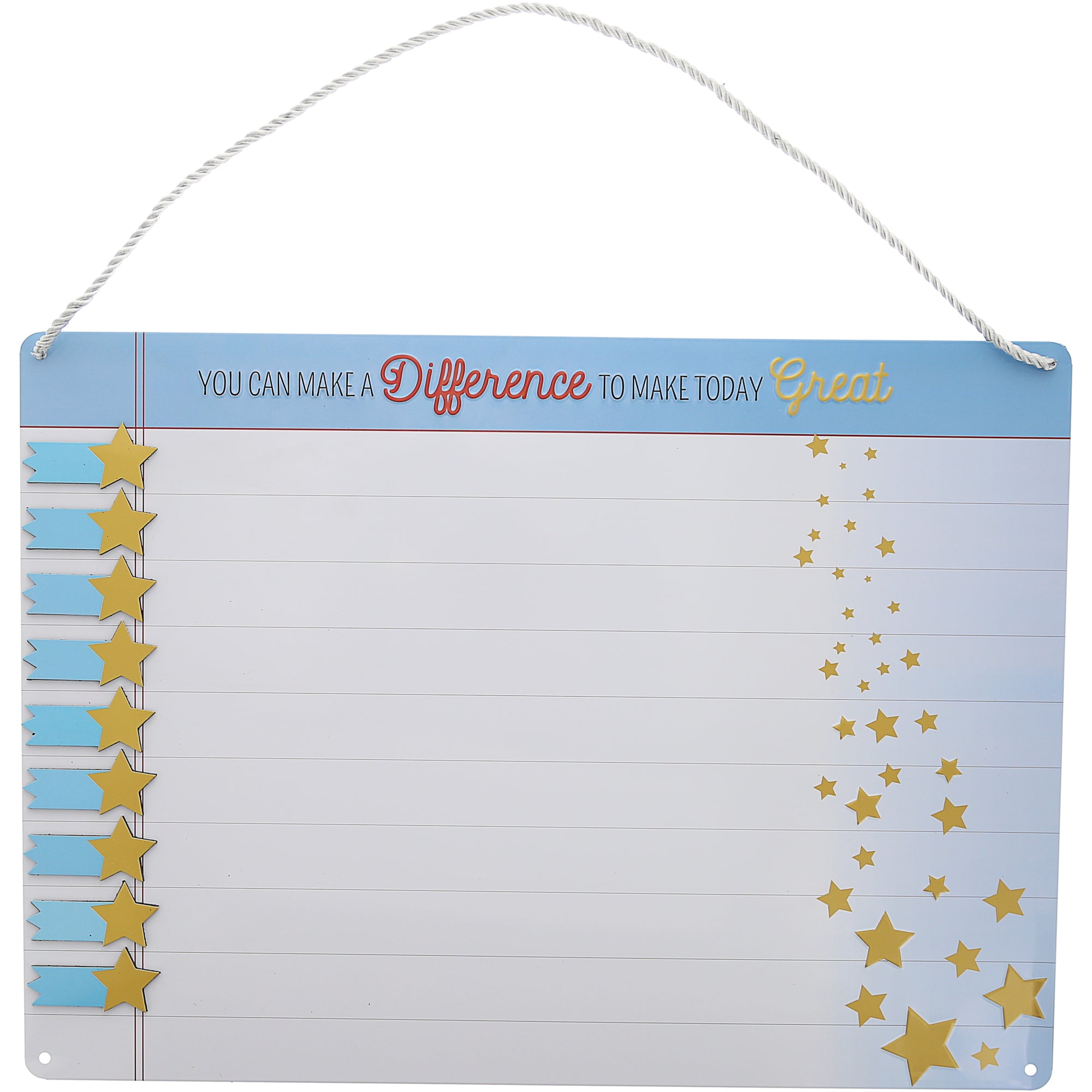 - IN-HOUSE DESIGN: The board has the embossed black, red, and gold sentiment "You Can Make A Difference To Make Today Great" on the top center of the blue, white, and red paper-lined notepad design. The stars are gold with a blue tail that leaves room for writing names or tasks for classroom activities. The falling golden star pattern features a handful of embossed stars; these stars are the achievable end zone goal.