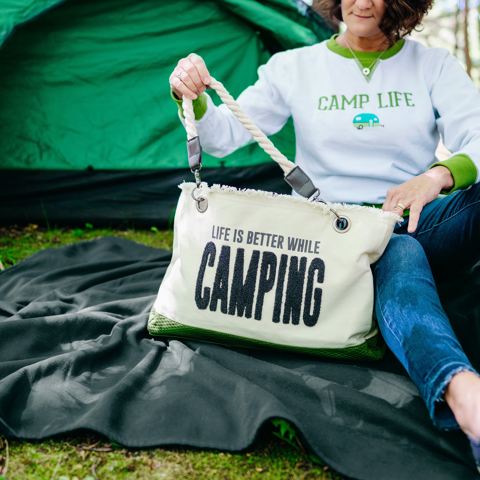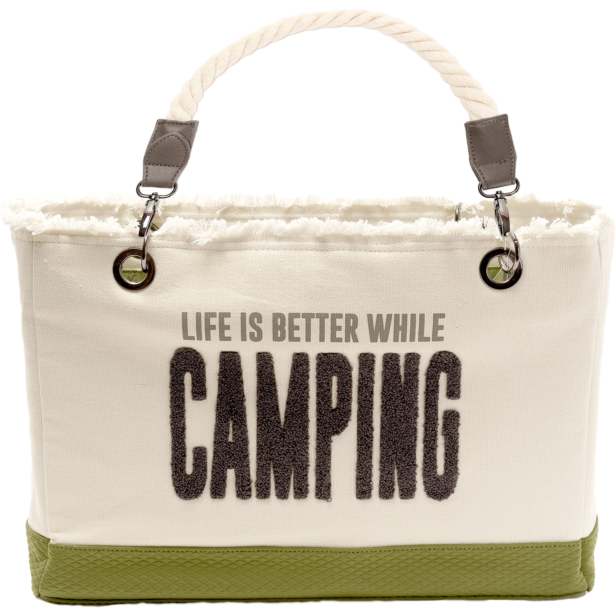 - IN HOUSE DESIGN: Tote is printed with "Life is Better at the Camp" sentiment and each bag has raised fuzzy applique letters. Magnetic snap closure allows for easy open and close. Cream colored soft rope handles feature a coordinating color to each specific design. Interior has printed cotton fabric matching the theme to make for a super fun tote inside and out! This large tote fits any lifestyle for a day trip or a weekend getaway.