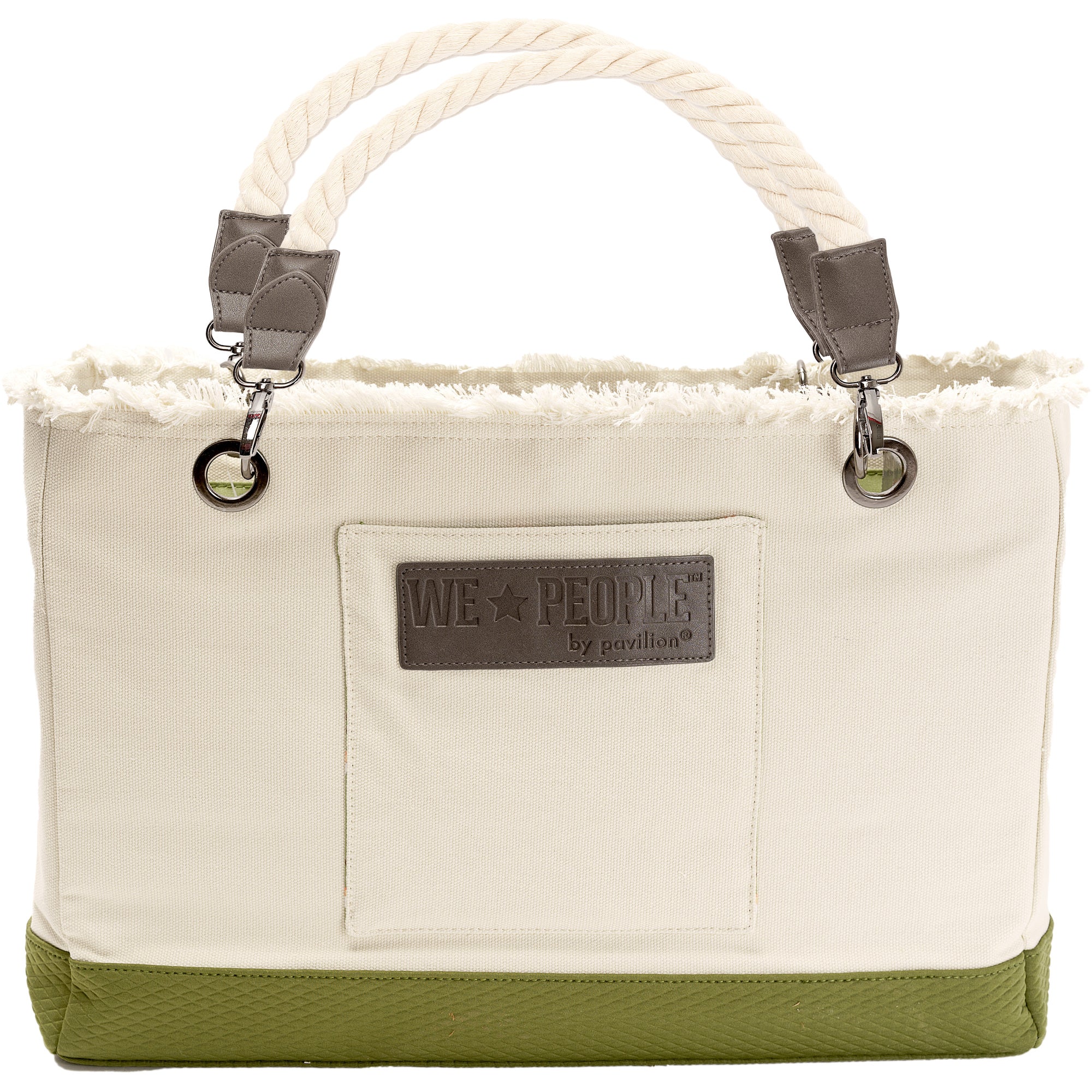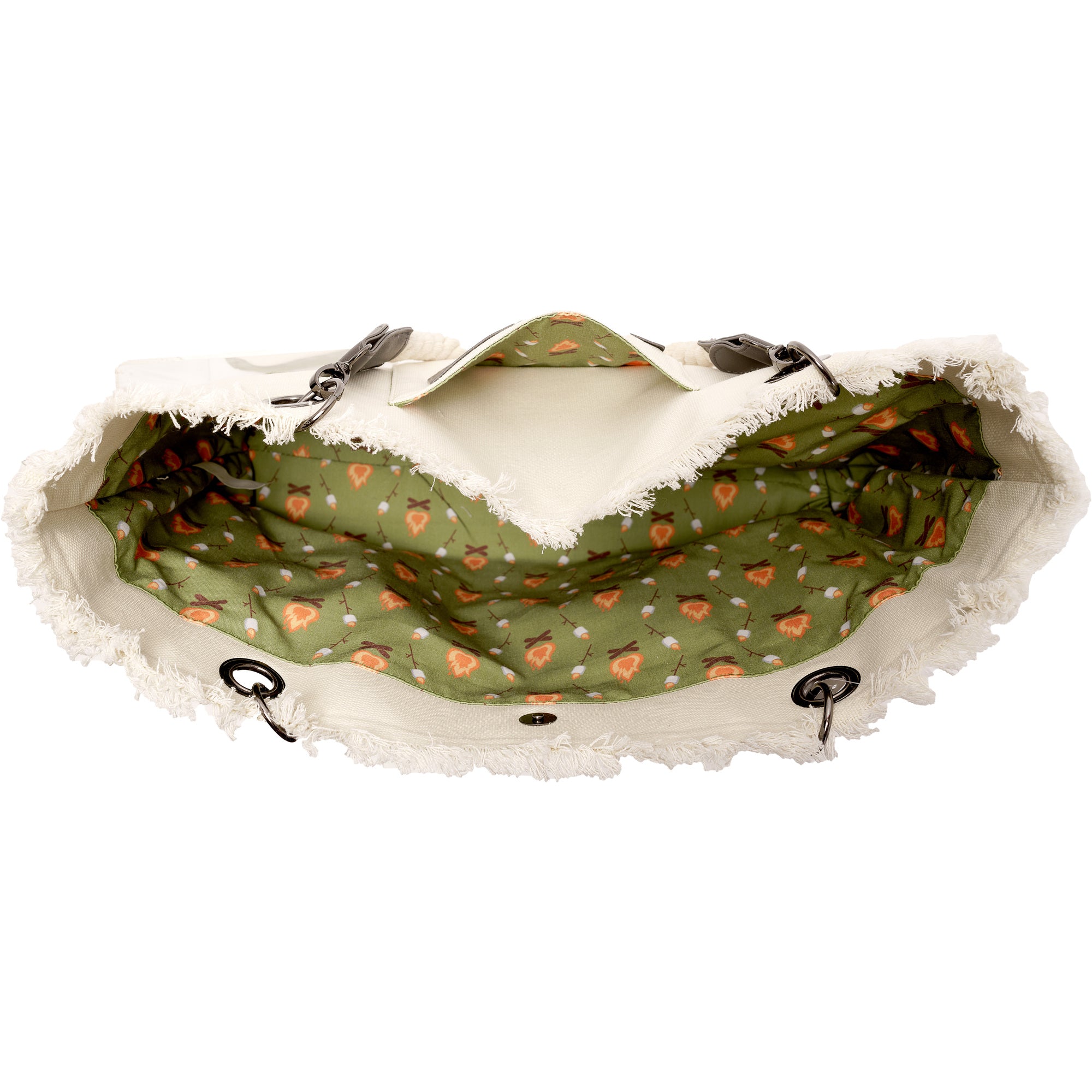 - PREMIUM QUALITY: 21" x 12" x 4" canvas tote fully lined with fabric to match camp sentiment on outside. Zippered inside pocket to safely separate and secure your important belongings. Handles are removable with gunmetal easy fasten clips. Neoprene structured bottom makes this tote easy to self stand and makes for a durable material to set down anywhere. Top of tote is fringed canvas material to provide an extra flare. The outside pocket is open and has plenty of room to stash your phone or sunglasses. Comes in a poly bag with a hang tag.