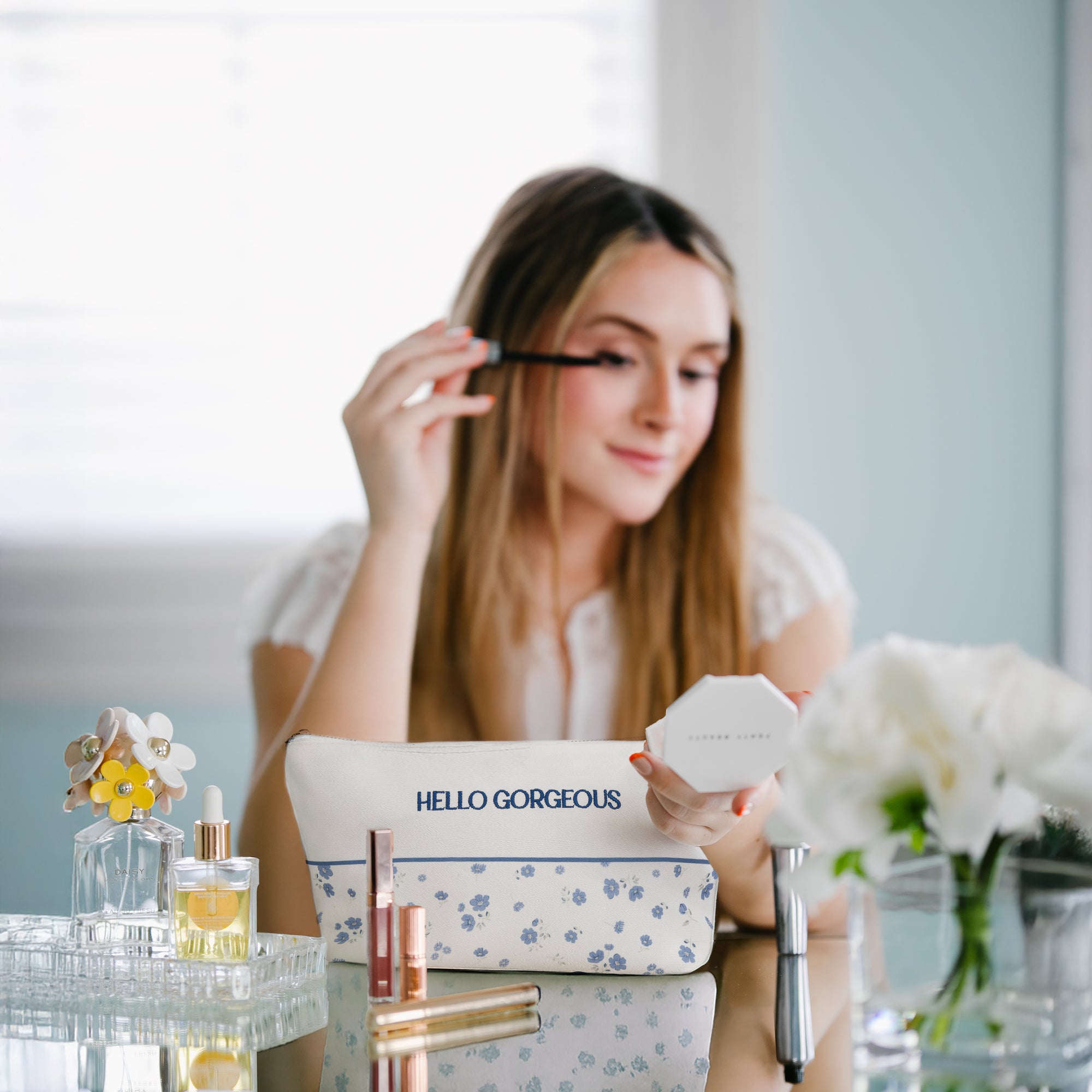 • IN-HOUSE DESIGN: Features soft white fabric accented with a blue floral printed bottom panel and the uplifting sentiment “Hello Gorgeous” printed across the top. Includes a sew-in side tag and a coordinating bottom logo for a polished, boutique-quality finish. The interior lining showcases a full floral print for a charming surprise inside.