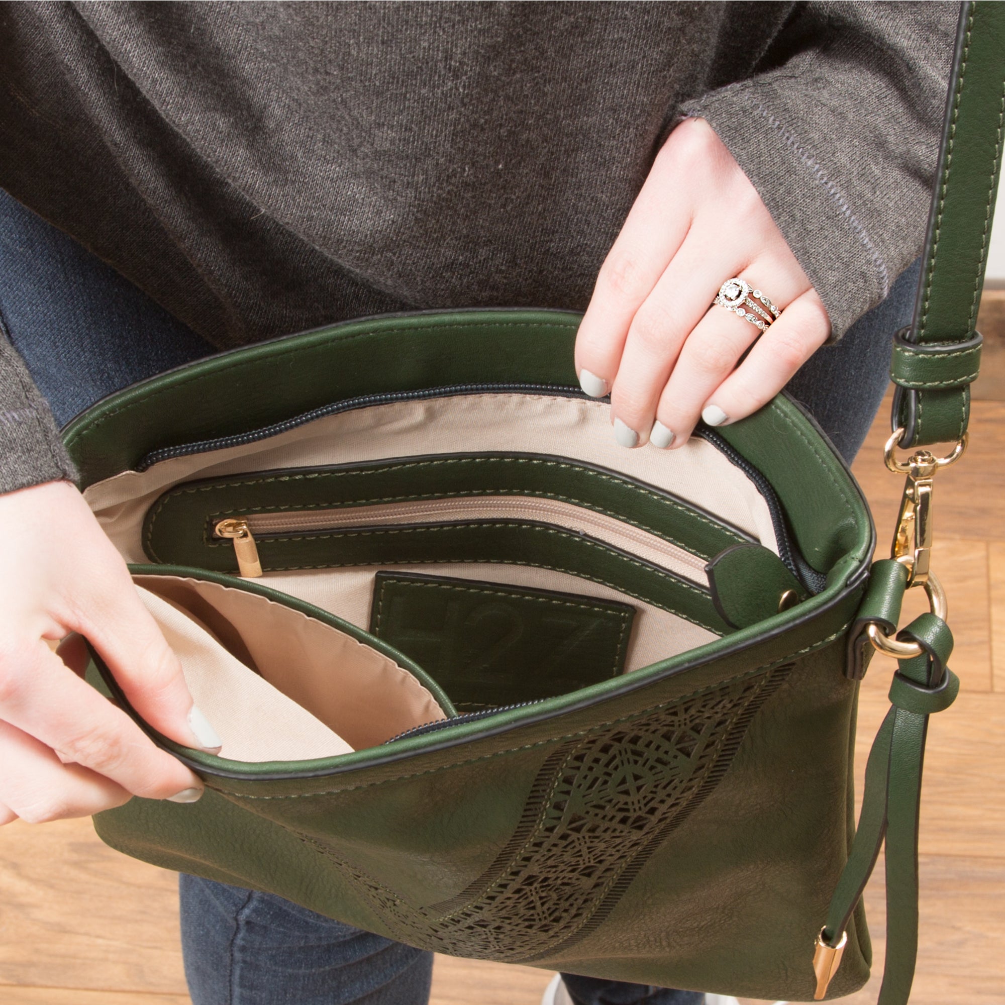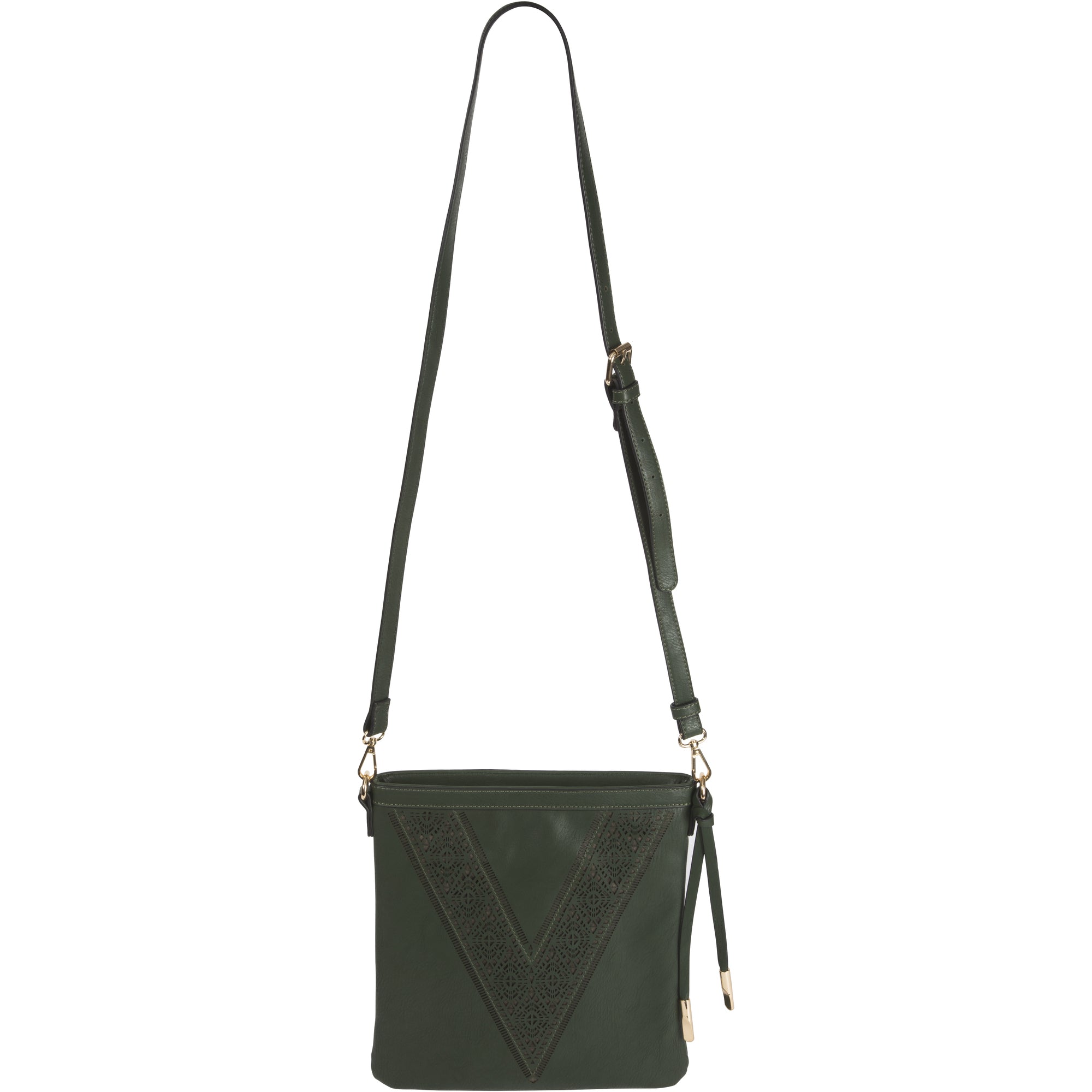 - IN-HOUSE DESIGN: Features laser-cut V-shape design, two open interior pockets, one interior zippered pocket, and adjustable strap.
