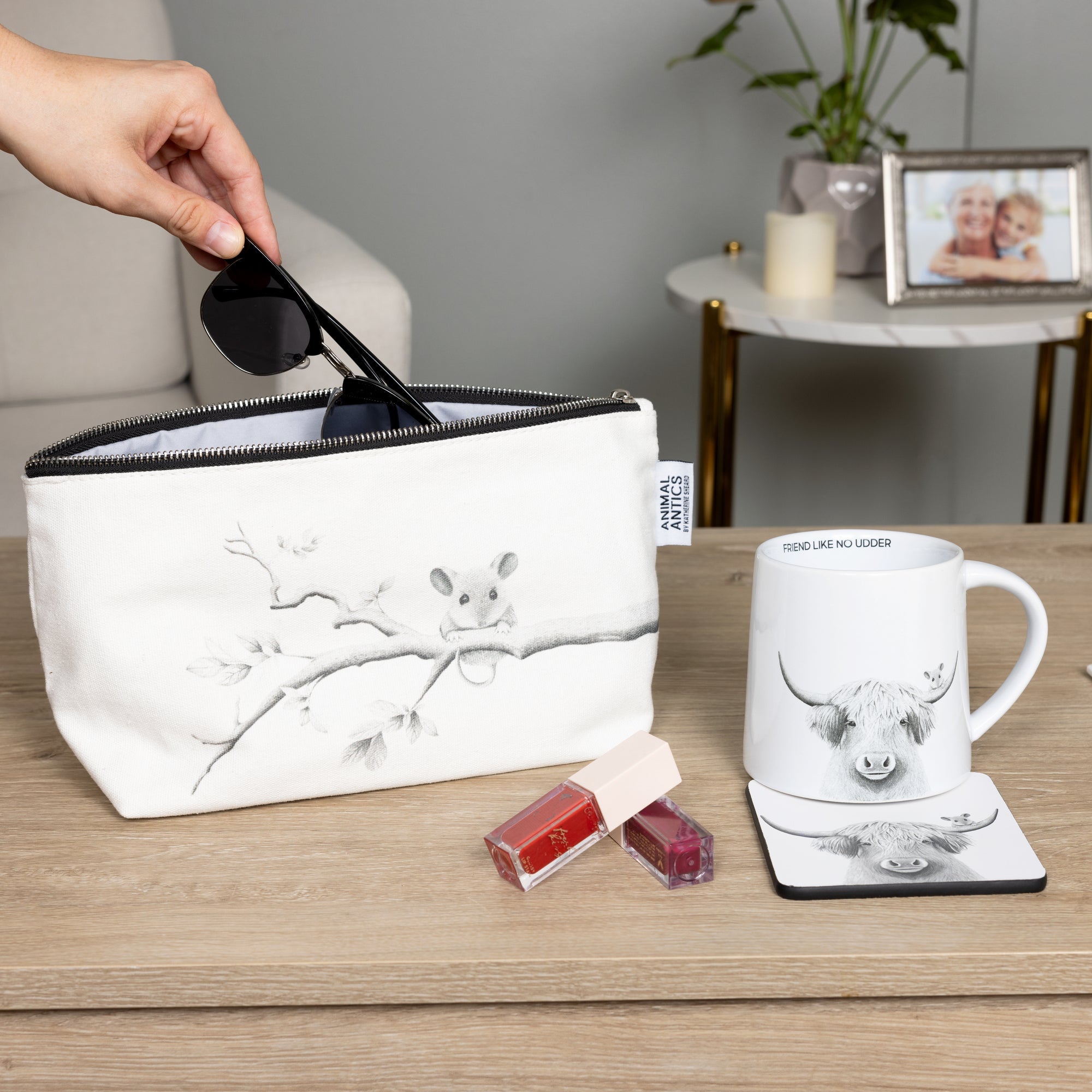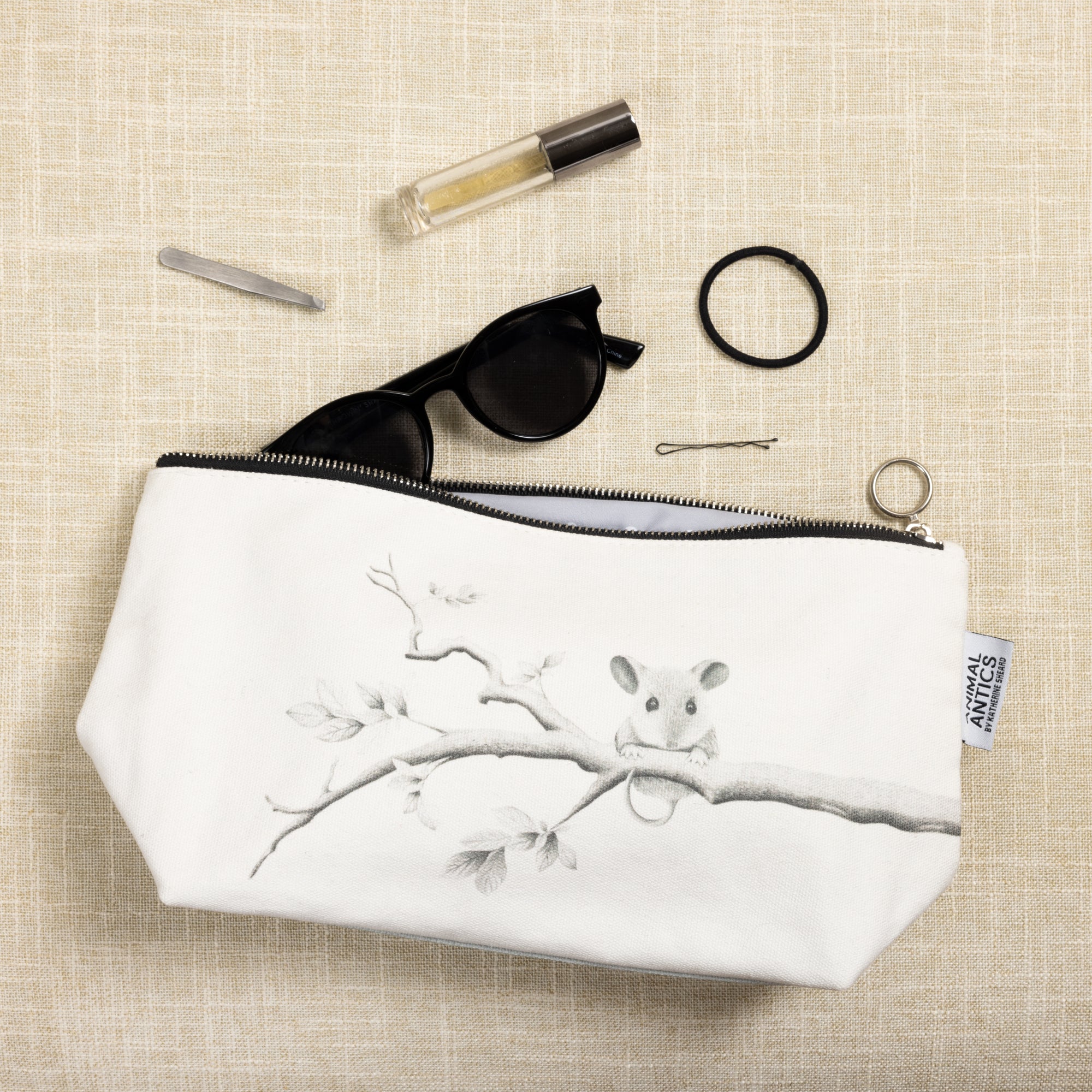 - IN-HOUSE DESIGN: The bag features a charming printed mouse sitting on a branch, bringing a touch of nature to your accessories. The sewn-in Katherine Sheard tag celebrates the artist’s work. Inside, you'll find gray fabric with white polka dots and logos.