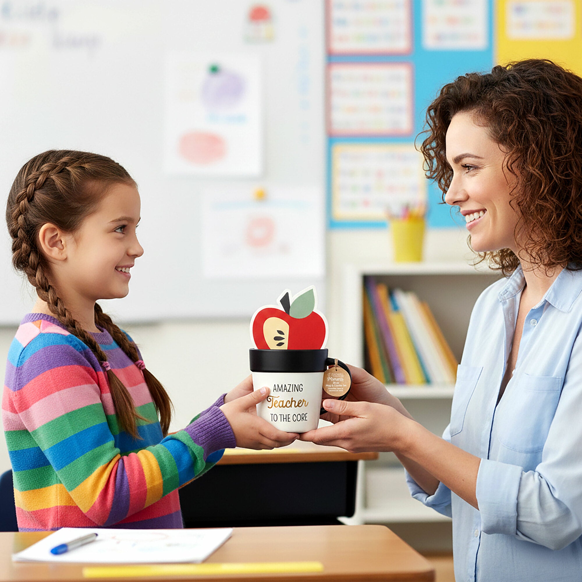 - IN-HOUSE DESIGN: From the Teachable Moments collection, this set features the sentiment “Amazing Teacher to the Core” with an apple-shaped coaster symbolizing knowledge and growth. The color palette of black, red, and gold was chosen to feel bold yet timeless—celebrating educators who inspire every day. Both mug and coaster include printed artwork that ties the theme together seamlessly.