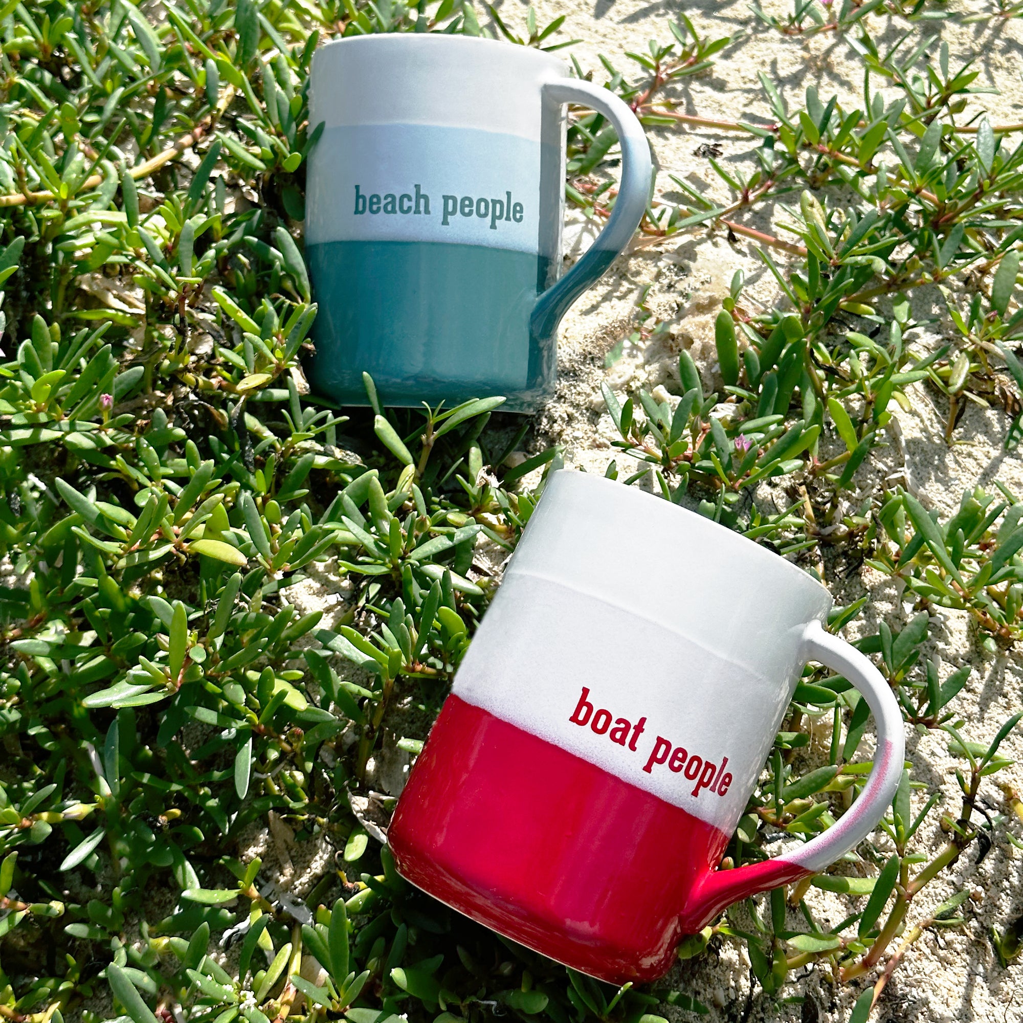 - IN-HOUSE DESIGN: The coffee cup features a triple-tone white, light teal & dark teal striped reactive glaze pattern accompanied by a "Beach People" teal sentiment in the front center towards the handle. Additionally, a unique teal silhouette pair of flip flops at the bottom interior of the mug is revealed as you drink your favorite coffee, tea, or other beverage.