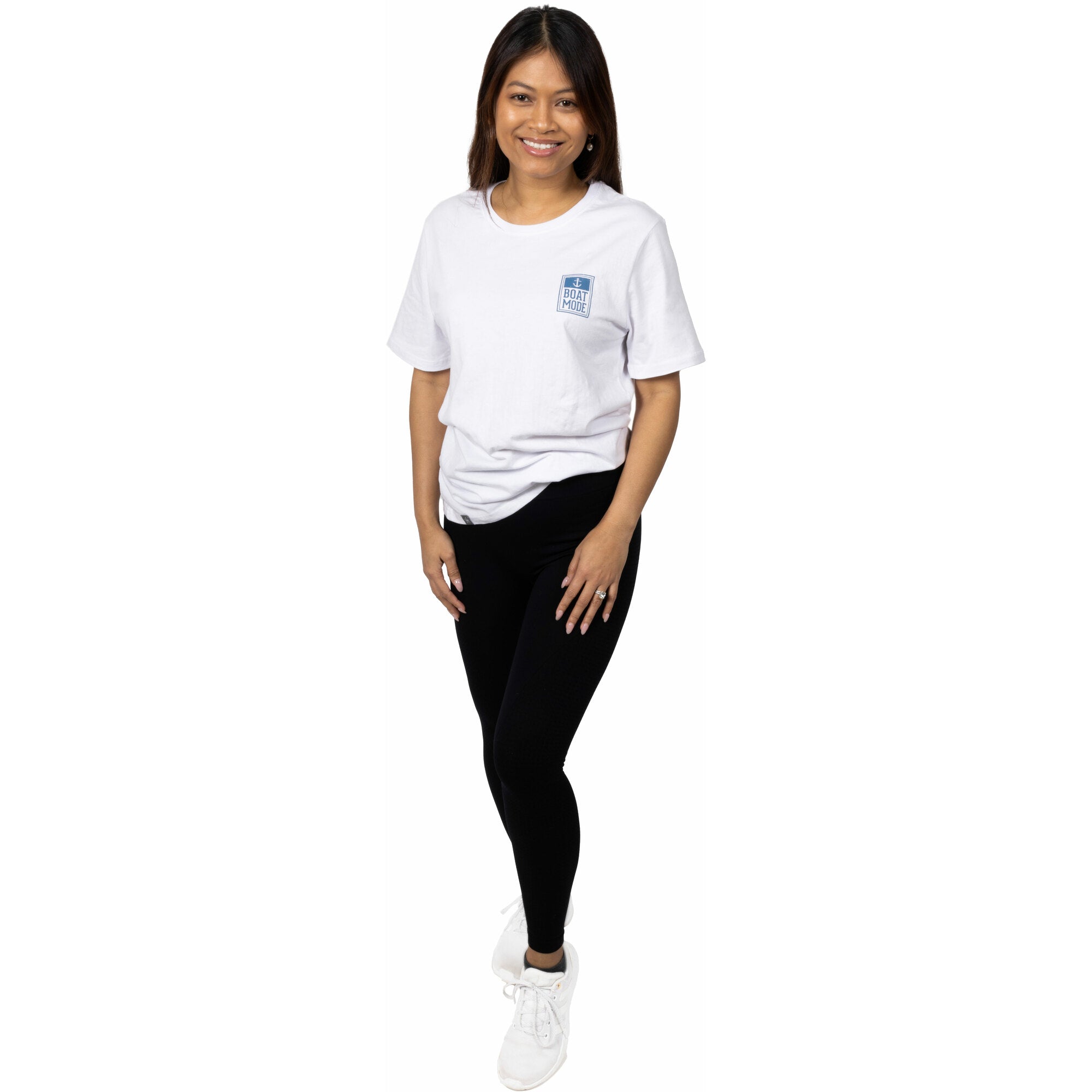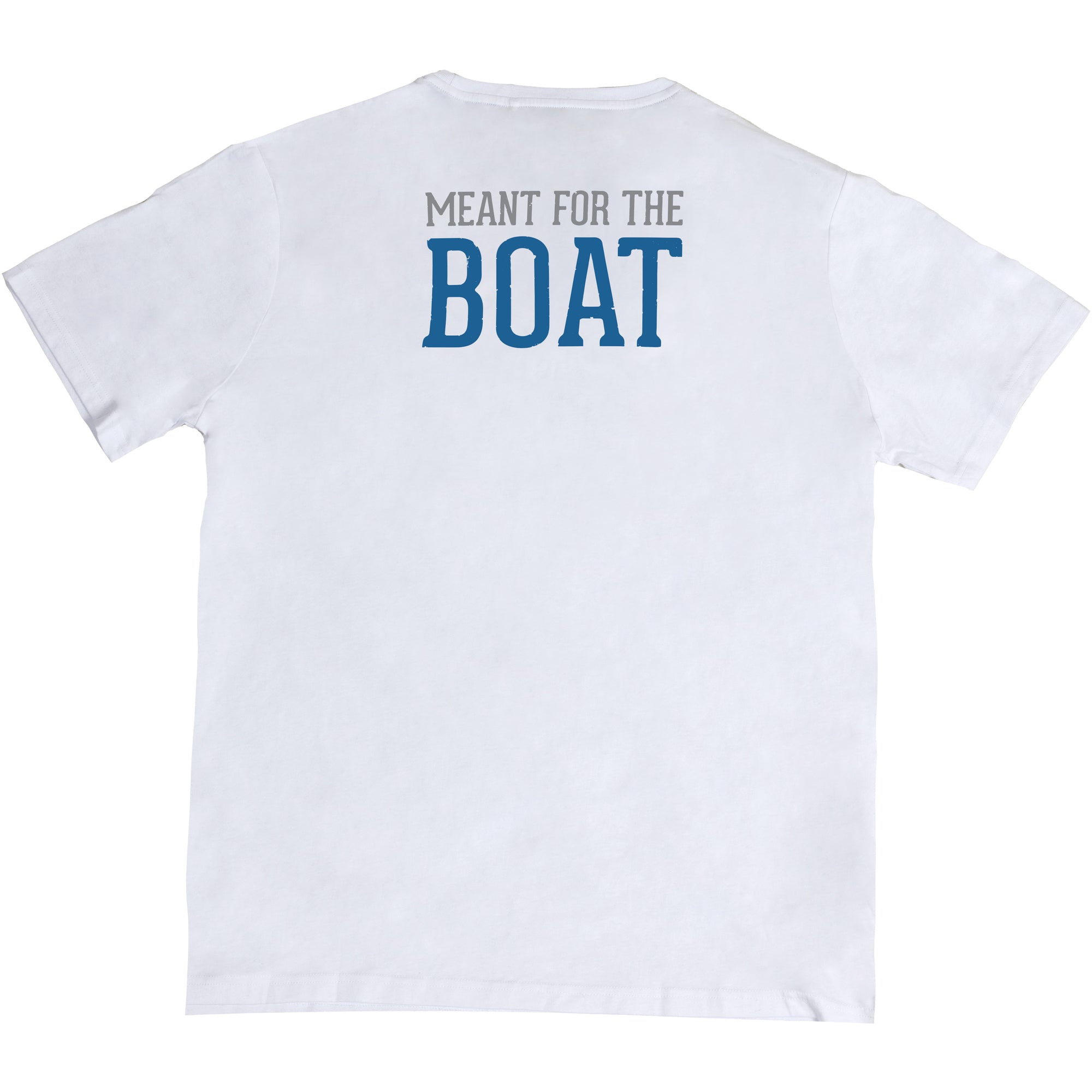 • IN-HOUSE DESIGN: The white shirt has a blue horizontal rectangular shape in the upper left chest area, which contains a white anchor & "BOAT MODE" sentiment inside an outlined design. The backside of the top has "MEANT FOR THE" in gray & "BOAT" in blue that stretches from each edge of the shoulder blade.