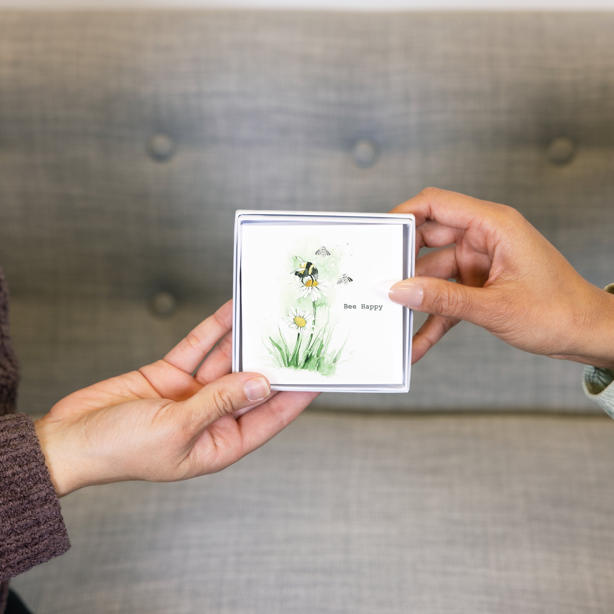 - IN-HOUSE DESIGN: The cheerful, celebratory printed watercolored summerscape, including grass, daisies, and a bumble bee collecting pollen, is designed with earrings on the top right. The gray sentiment of the typewriter, "Bee Happy," is placed in the right center.