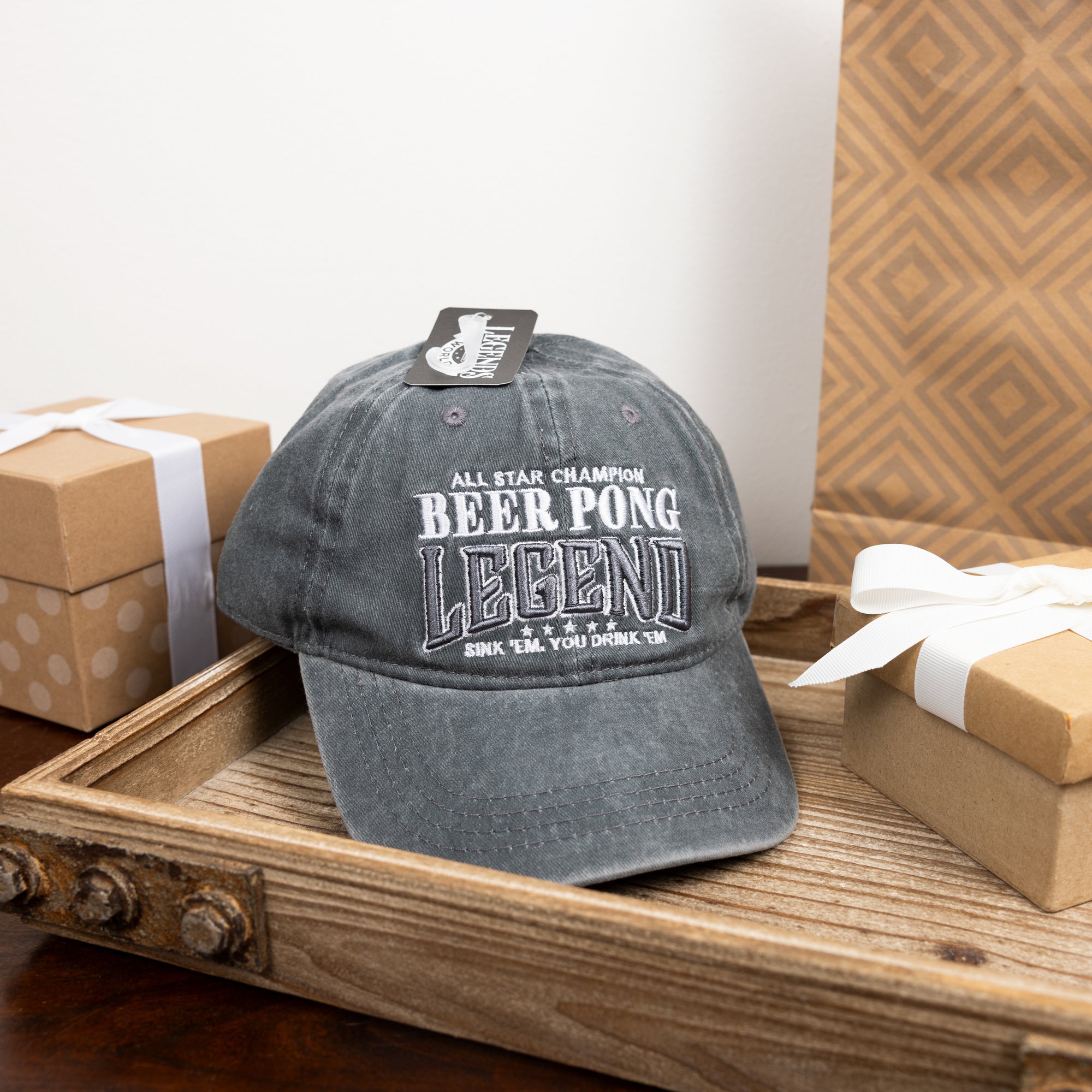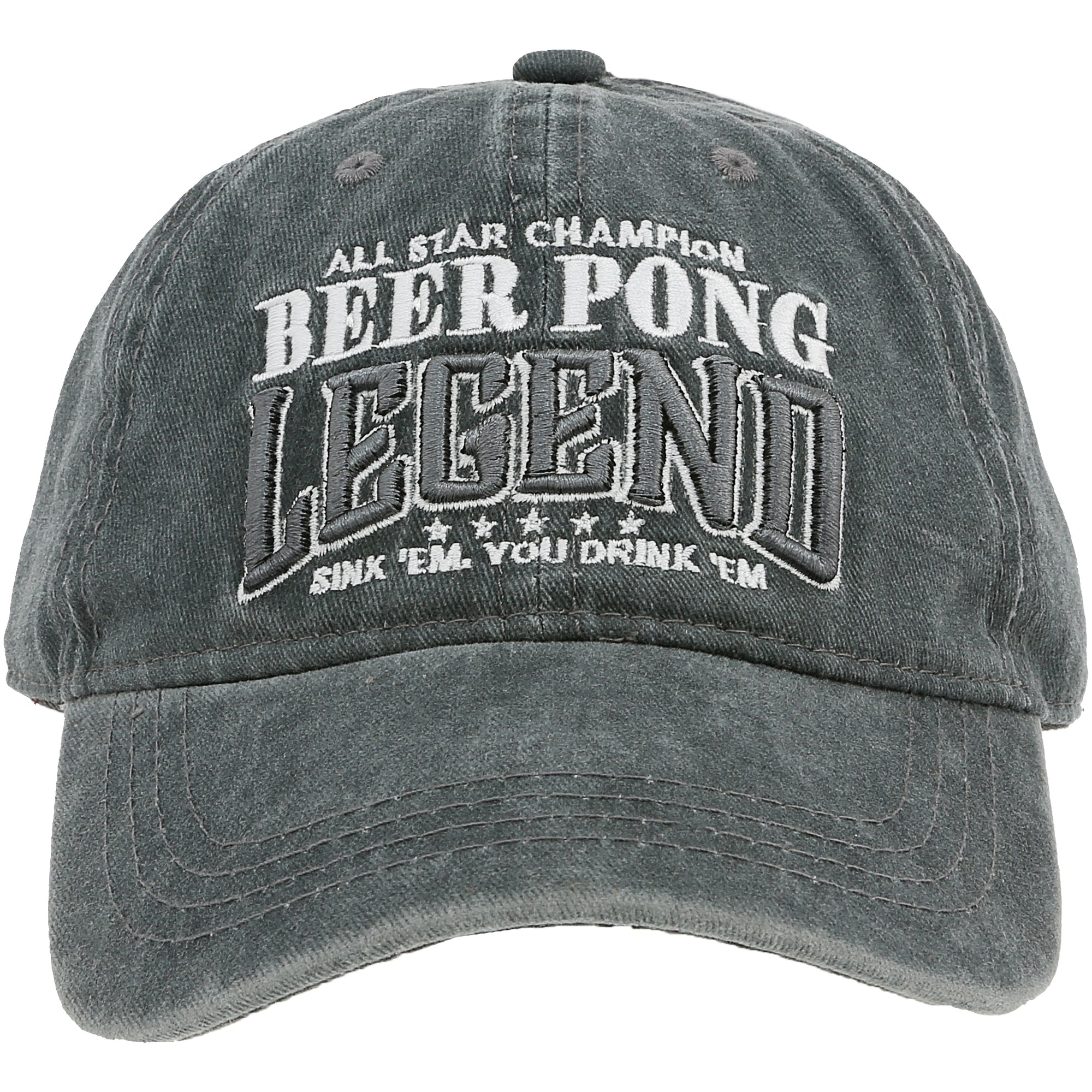 - PREMIUM QUALITY: This black washed hat is crafted from 100% cotton, perfect for the beer pong champion. The sentiment "Beer Pong Legend" is embroidered in white and gray, complete with beer pong icons.