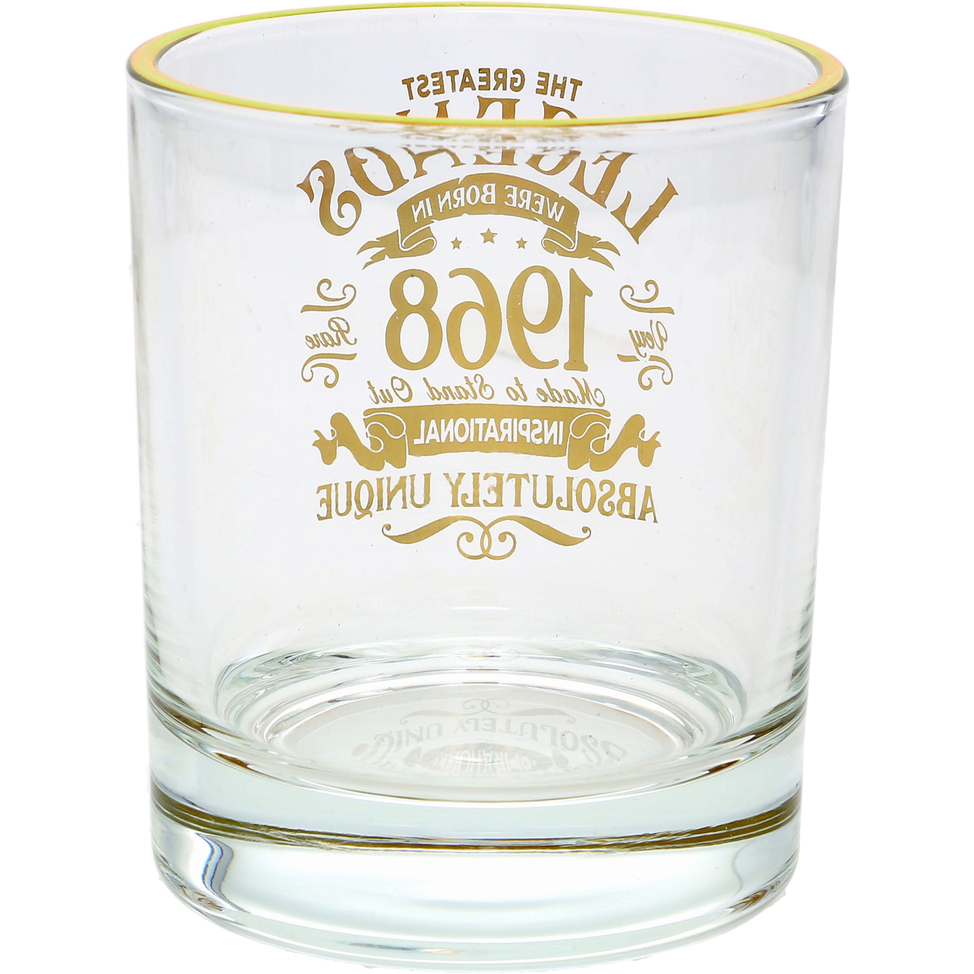 - IN-HOUSE DESIGN: The gold electroplated rim is accompanied by the gold "The Greatest Legends Were Born In 1968, Very Rare, Made To Stand Out, Inspirational, Absolutely Unique." sentiment decal on the front side of the whiskey along with banners and stars.