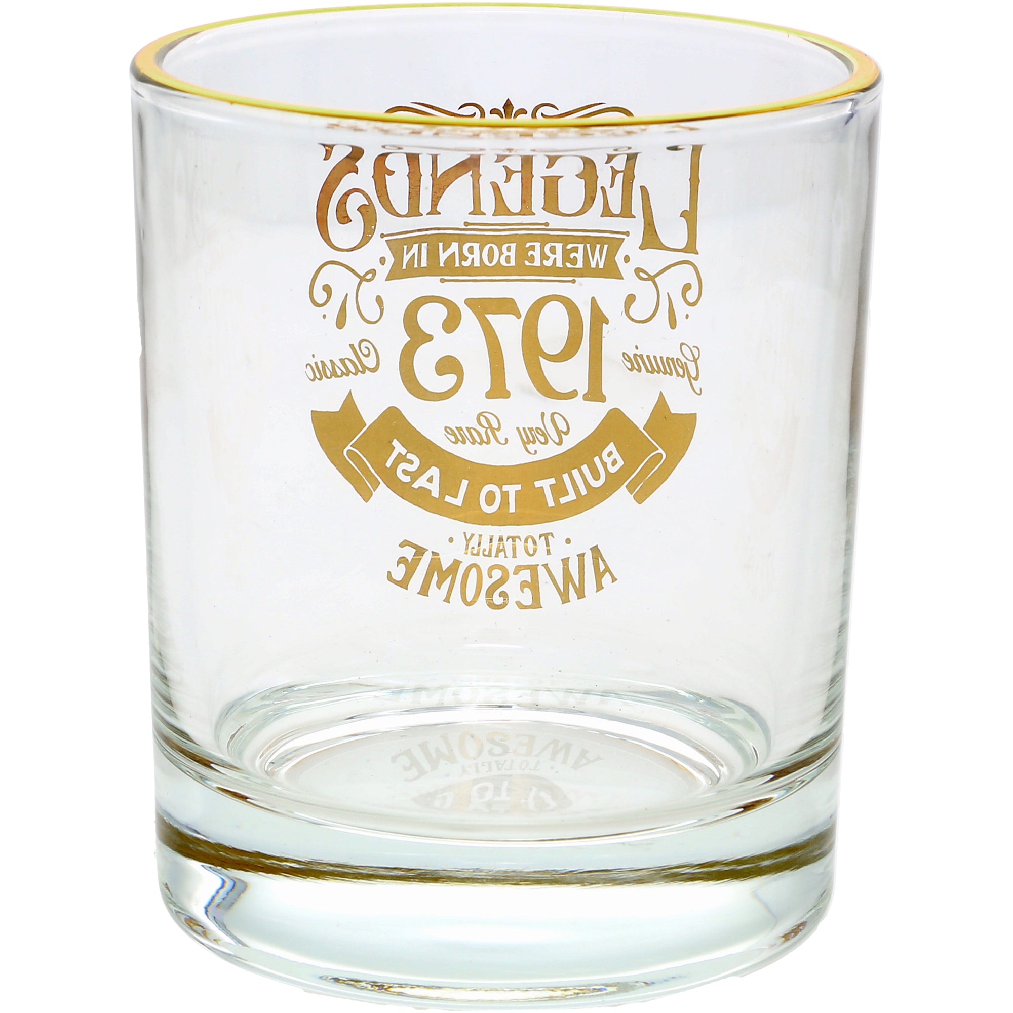 - IN-HOUSE DESIGN: The gold electroplated rim is accompanied by the gold "Legends Were Born In 1973, Genuine Classic, Very Rare, Built To Last, Totally Awesome" sentiment decal on the front side of the whiskey along with banners and stars.