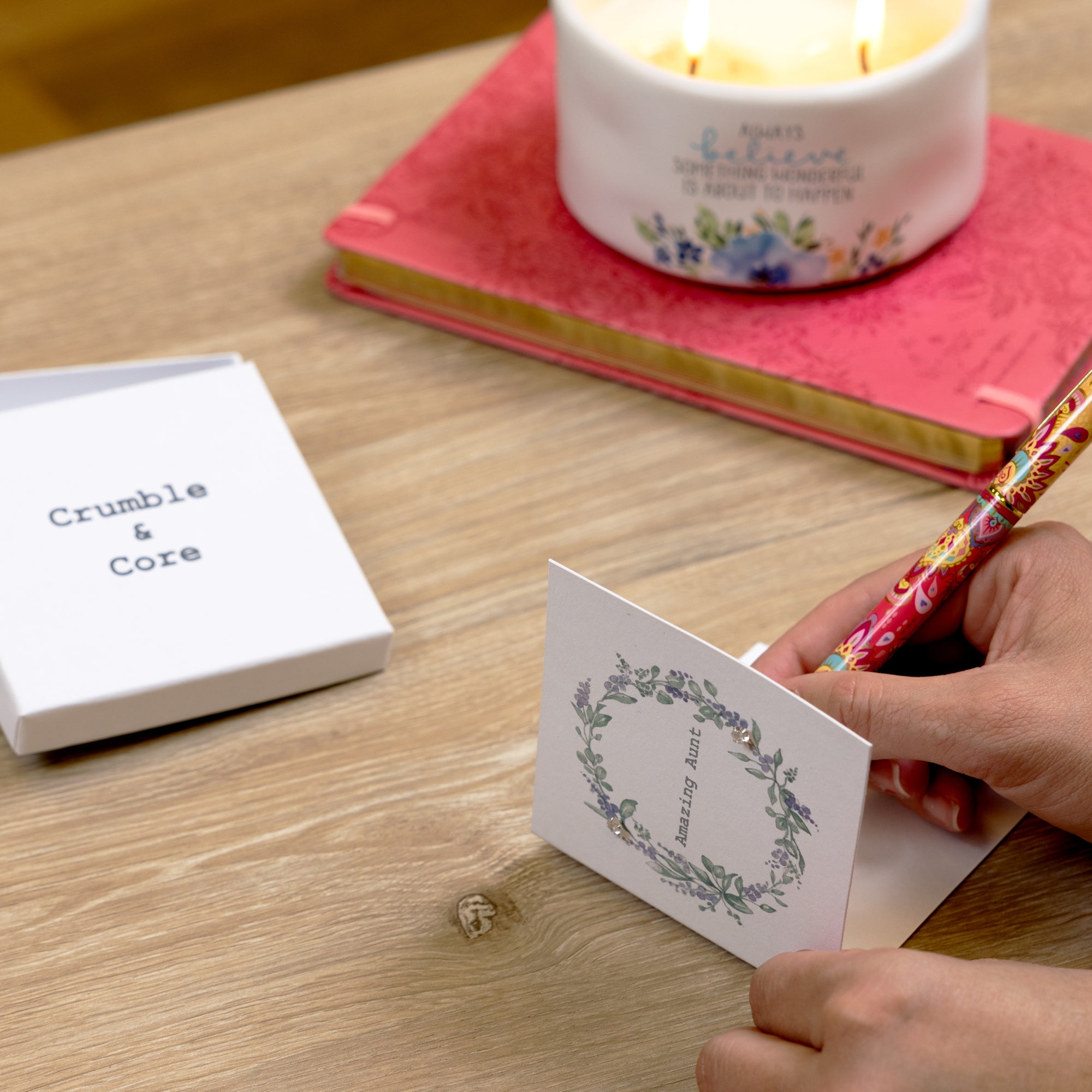 - IN-HOUSE DESIGN: The cheerful celebratory printed watercolored purple lavender flower and greenery wreath with the earrings strategically placed within the floral design. The typewritten gray "Amazing Aunt" sentiment is placed in the circle's center.
