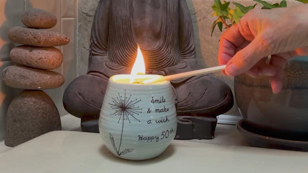 • IN-HOUSE DESIGN: "Smile & Make A Wish; Happy 50th" text on the front of the candle is printed, as are the accompanying dandelion details.