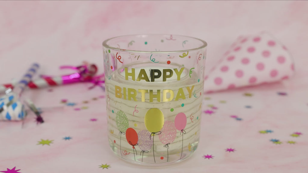 - IN-HOUSE DESIGN: The vessel features a vibrant multicolor confetti print and cheerful balloon graphics that wrap the entire glass. The "Happy Birthday" text is in bold gold metallic, adding a touch of elegance.