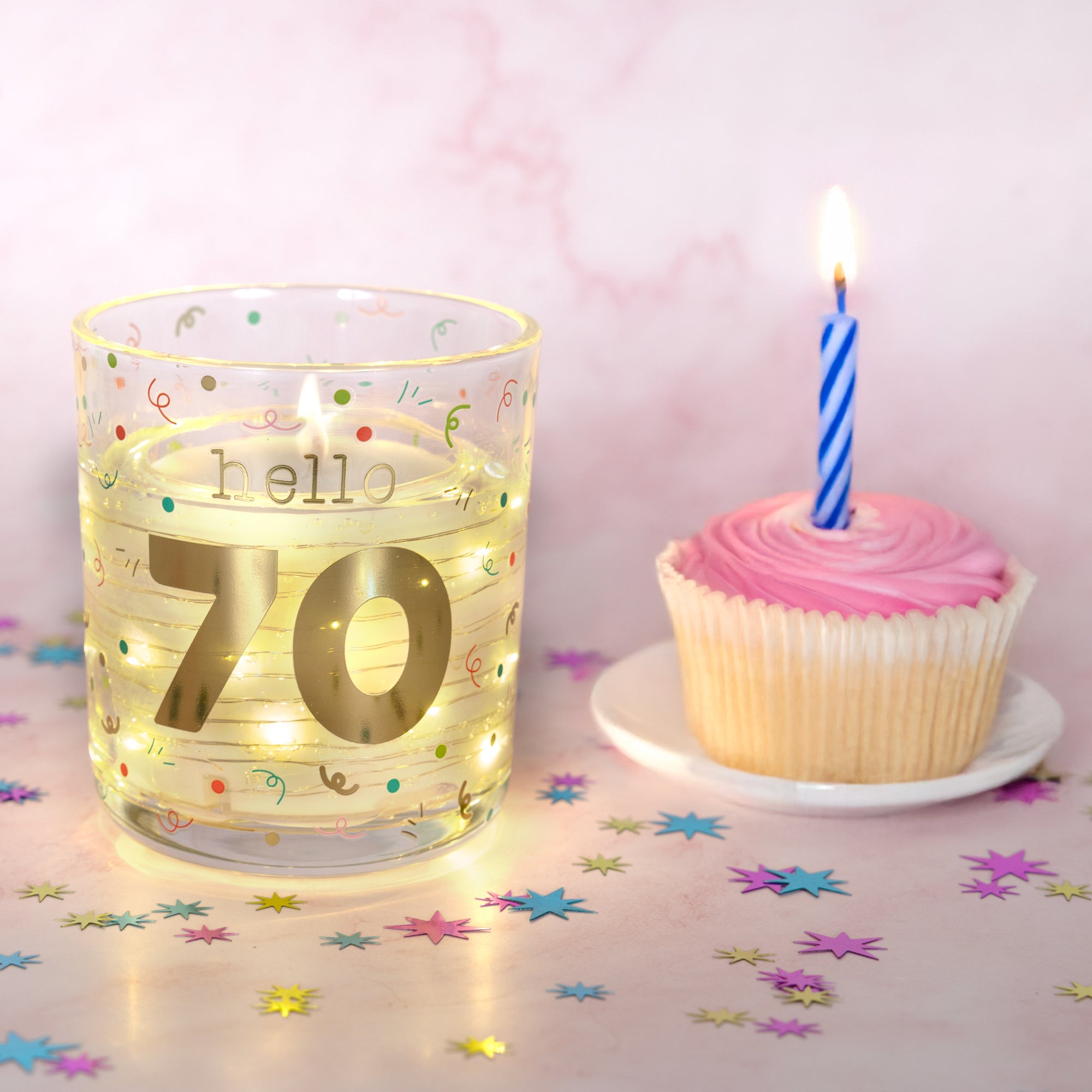 - PREMIUM QUALITY: This single-wick soy wax LED candle features a colorful confetti design on a sturdy glass vessel. The "Hello 70" gold metallic text is prominently displayed alongside festive balloons, adding a celebratory touch. This candle can be lit or you can use a candle lamp to activate the LED lights. Packaging includes a Kraft die-cut box, making it gift-ready.