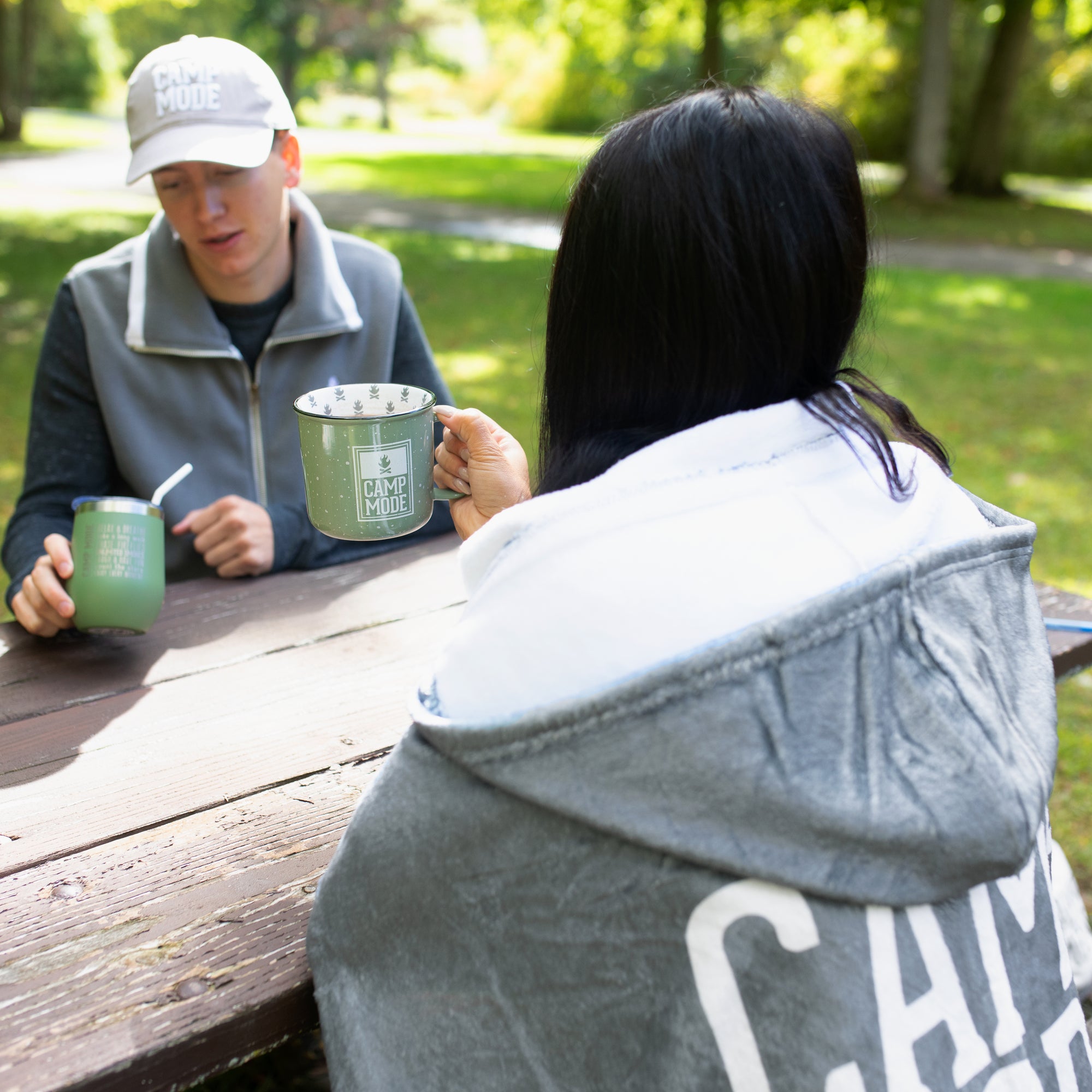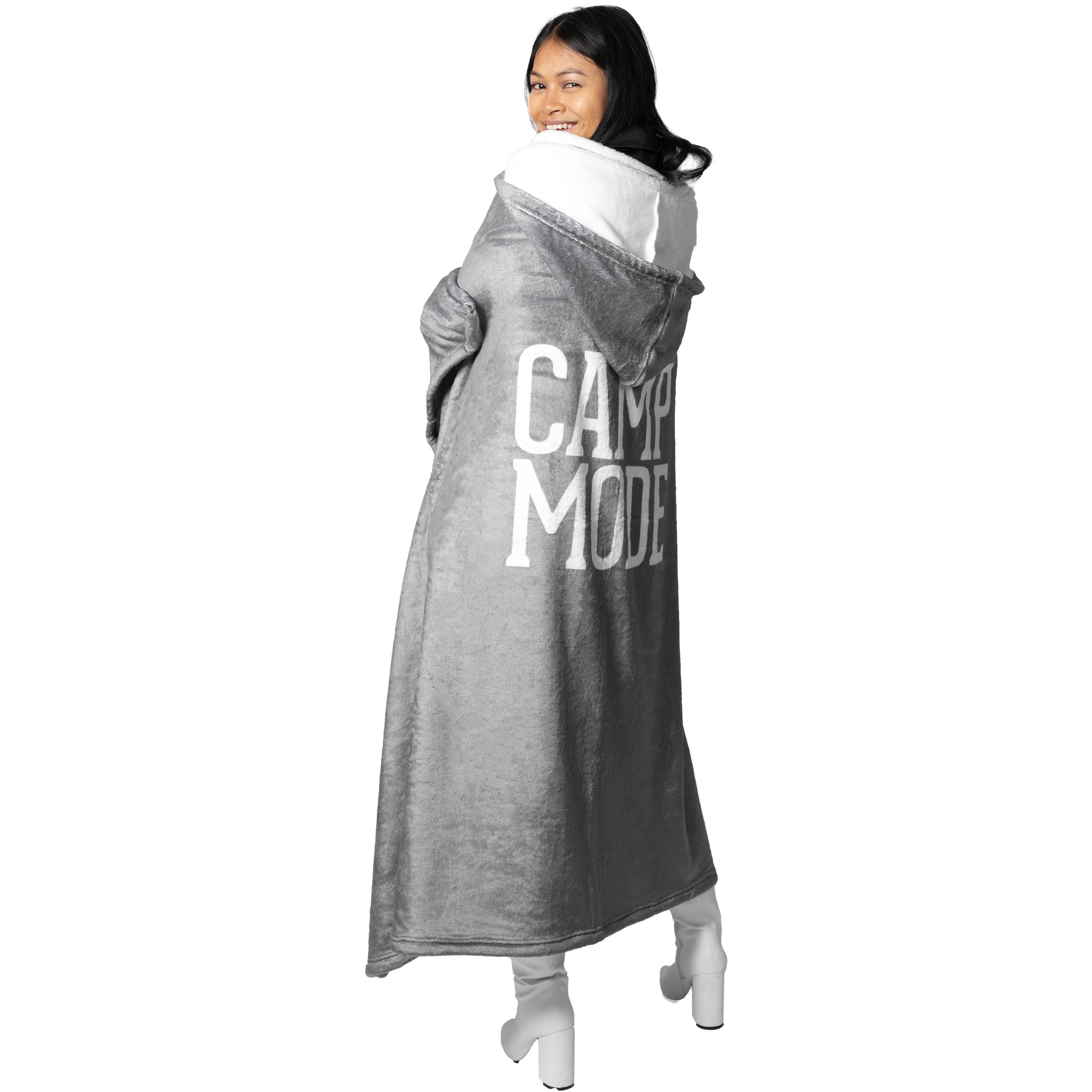 - IN-HOUSE DESIGN: All white interior with a gray exterior and large white "Camp Mode" sentiment printed onto the center back of the cloak. The pockets are perfect for putting hands into to wrap up tight with warmth and maybe even hold some small snacks or a phone.