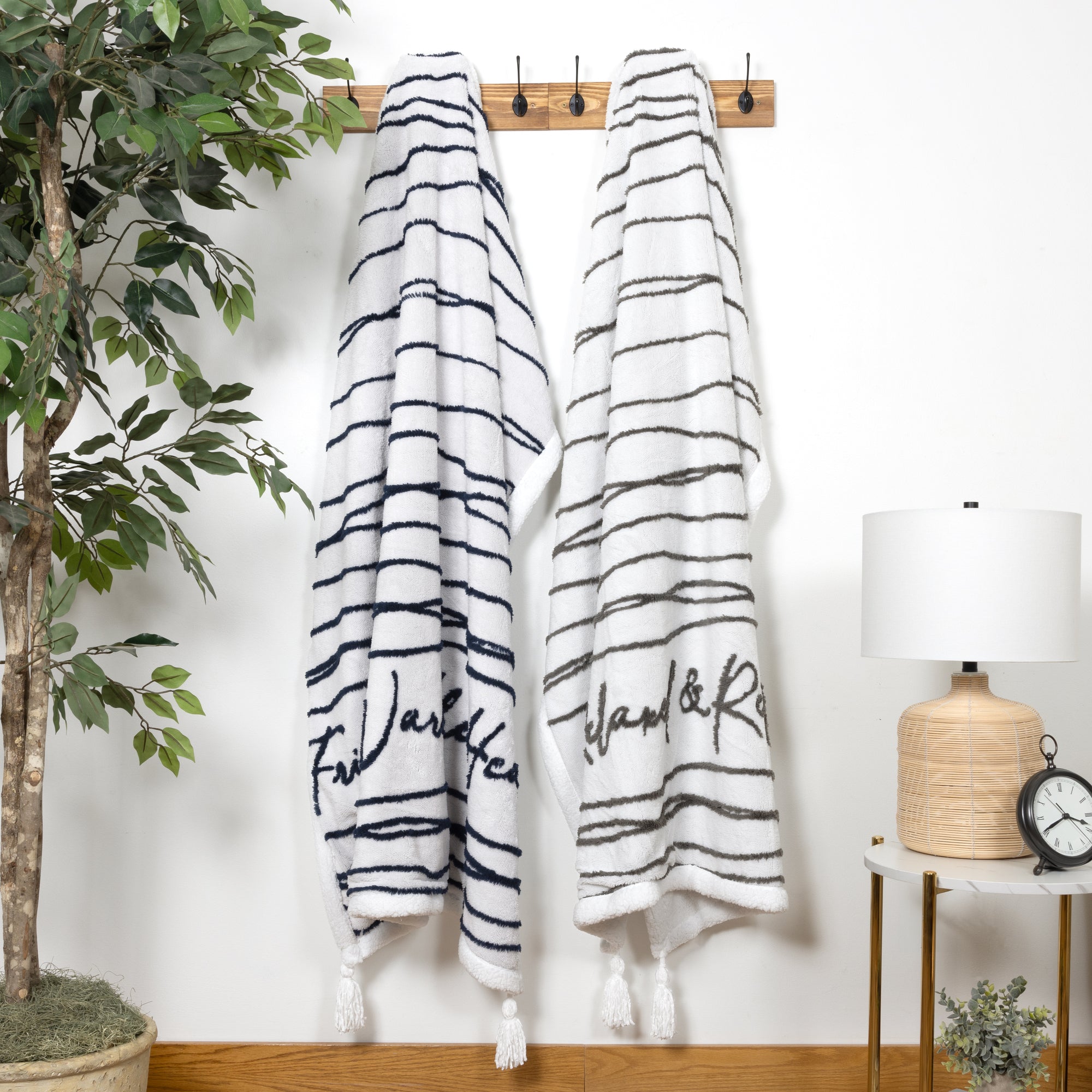 - PREMIUM QUALITY: 50" long x 60" tall and .5" wide premium throw is made from 400 GSM, 100% polyester plush jacquard with four hand-made knotted tassels at each corner. The excellent packaging consists of a silk white bow-tied ribbon with a gray cardboard band containing material and sizing information. Attached is a thick paper tag with the entire blanket sentiment. The blanket is neatly folded and securely attached to white wood and a silver metal hook hanger.