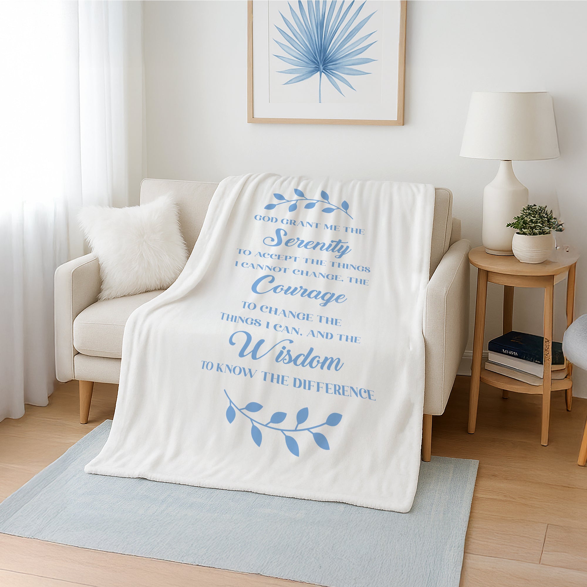 - IN-HOUSE DESIGN: Features the beloved Serenity Prayer printed in calming blue lettering surrounded by gentle botanical accents. The crisp white fabric paired with soft blue tones creates a peaceful, soothing aesthetic. Printed artwork appears centered and clear without stiffness, ensuring the blanket remains soft, flexible, and inviting.