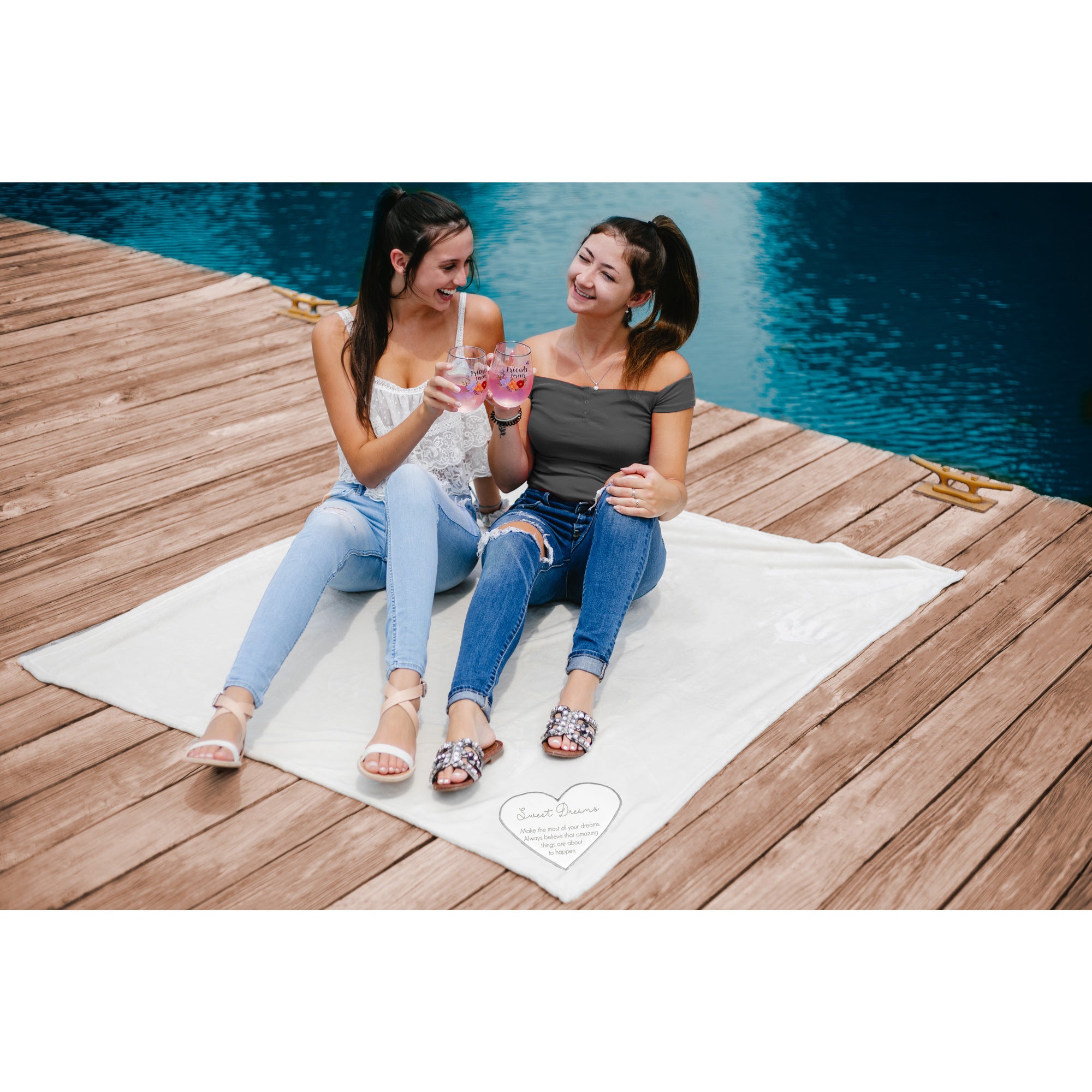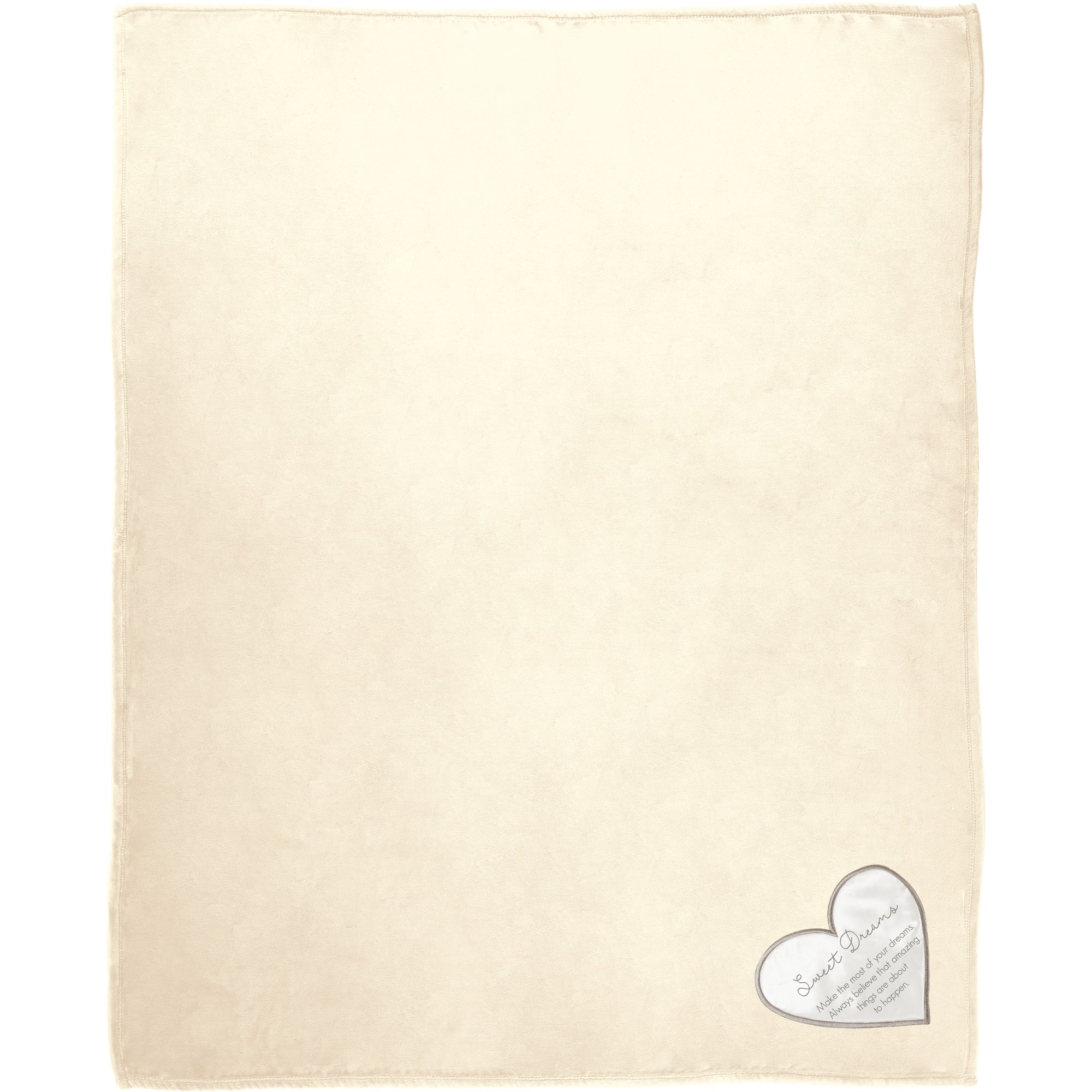 - IN-HOUSE DESIGN: Beige "Sweet Dreams - Make the most of your dreams. Always believe that amazing things are about to happen" printed uplifting and comforting sentiment is featured on the bottom right corner of the front of the silver/gray home décor blanket on a white heart embroidered edge patch.