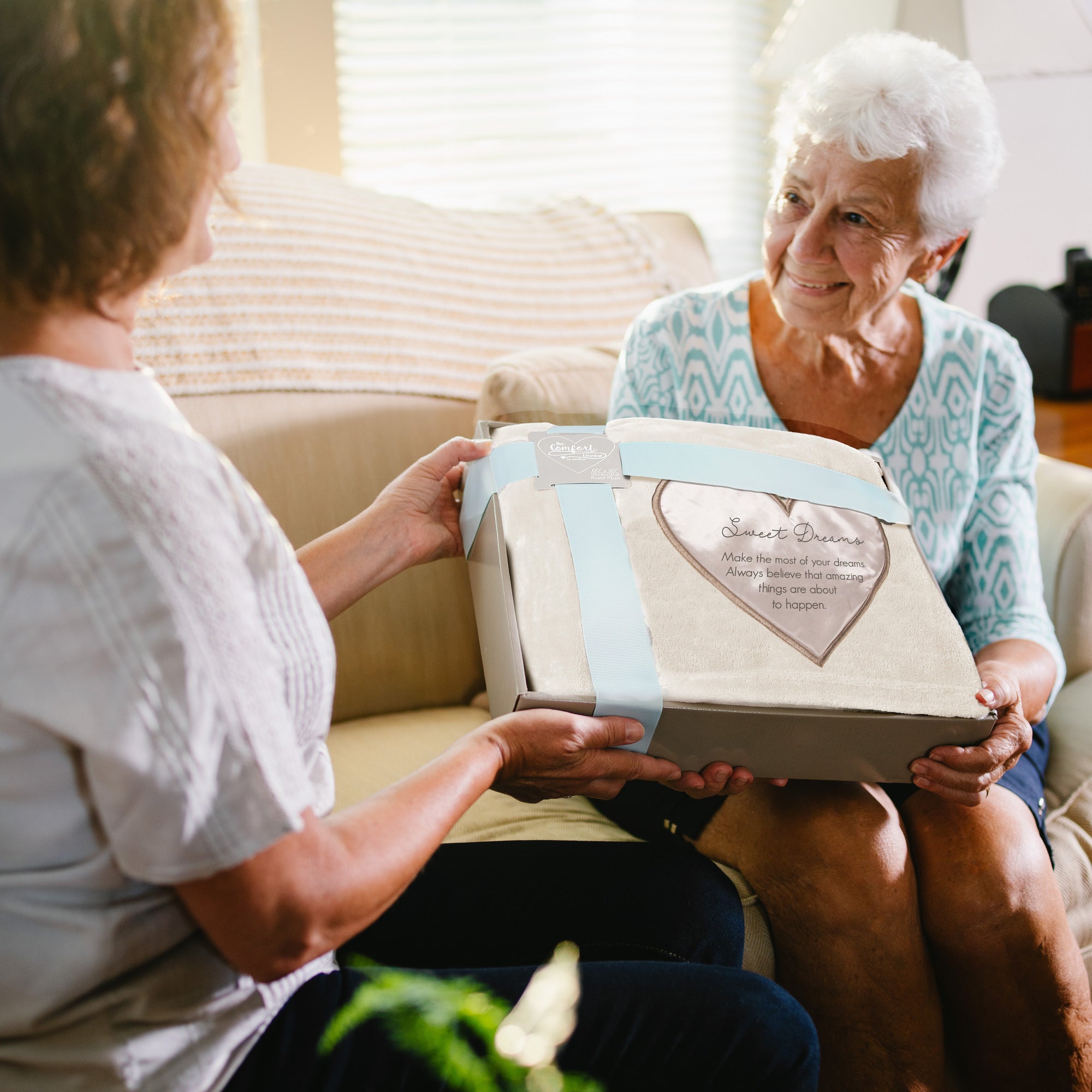 - PREMIUM QUALITY: 50" x 60" luxurious neutral cozy soft bed or couch throw blanket is made from 100% polyester royal plush 320 GSM fabric with silk detail. Beautiful gift packaging showcases the sewn-in satin patch with a calming teal ribbon outside on the sturdy beige box wrapped in a plastic polybag.