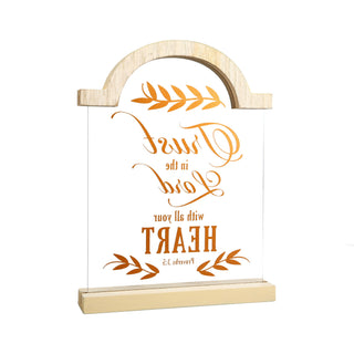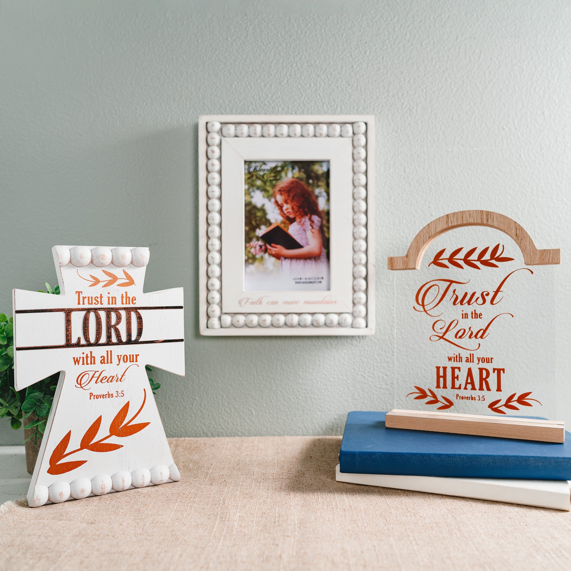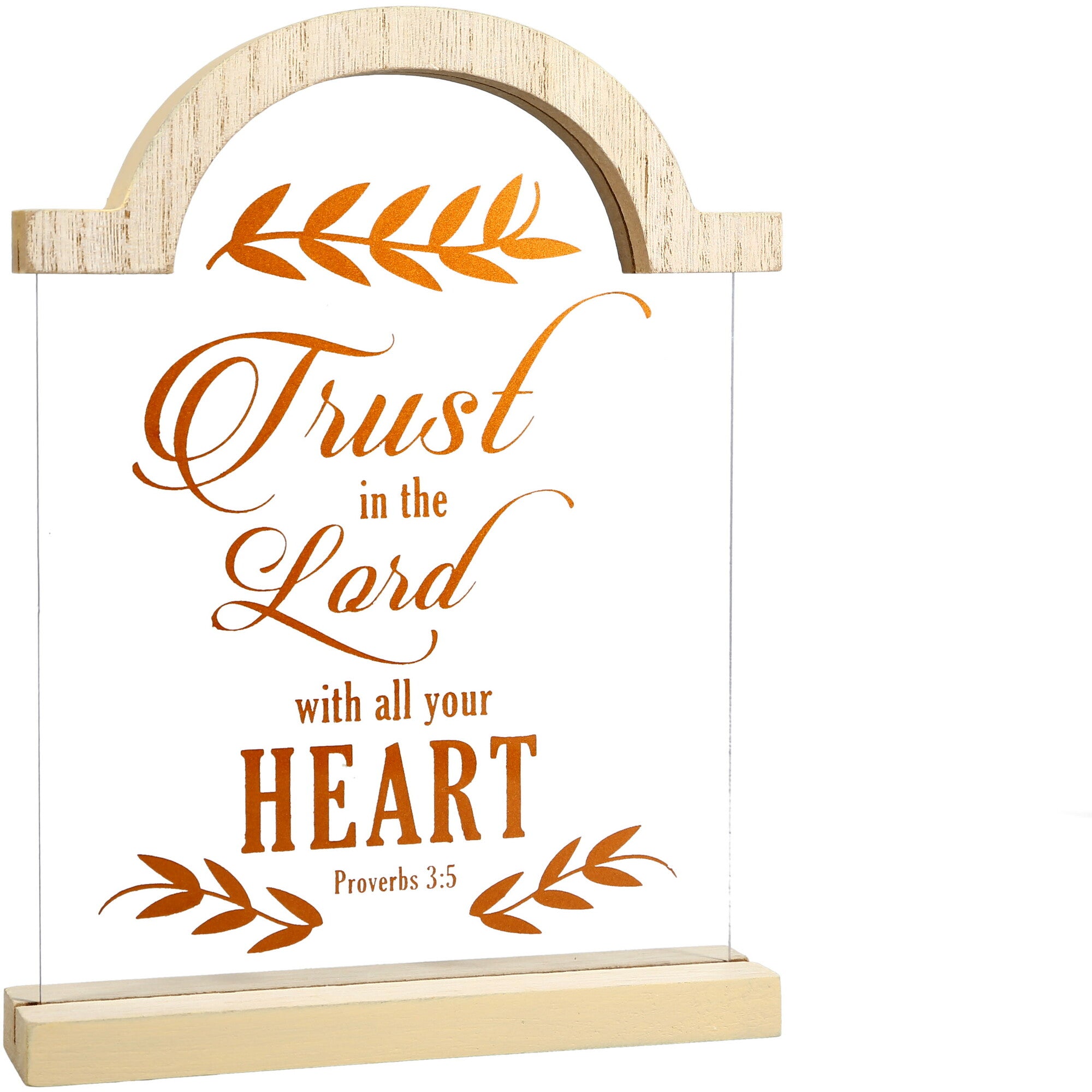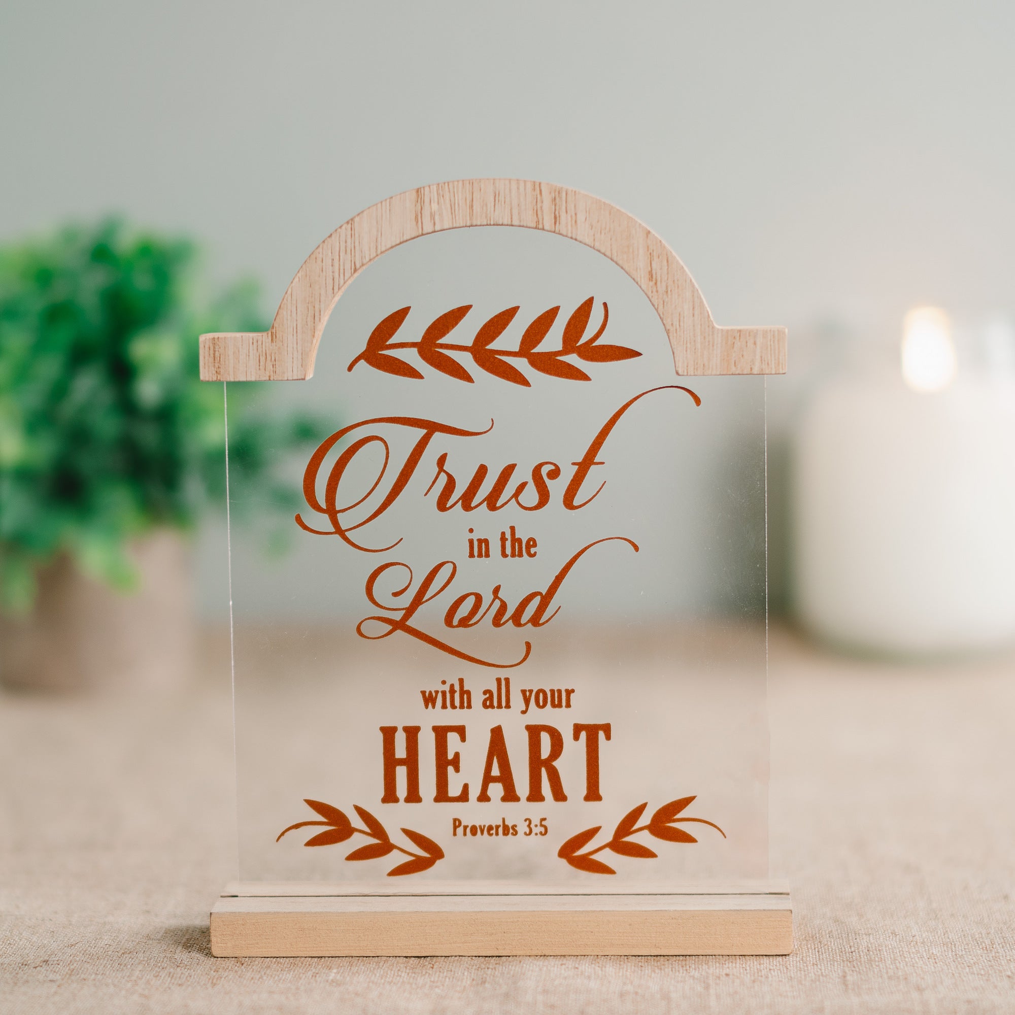 • IN-HOUSE DESIGN: "Trust In The Lord With All Your Heart - Proverbs 3:5" text is printed onto the front of the plaque.