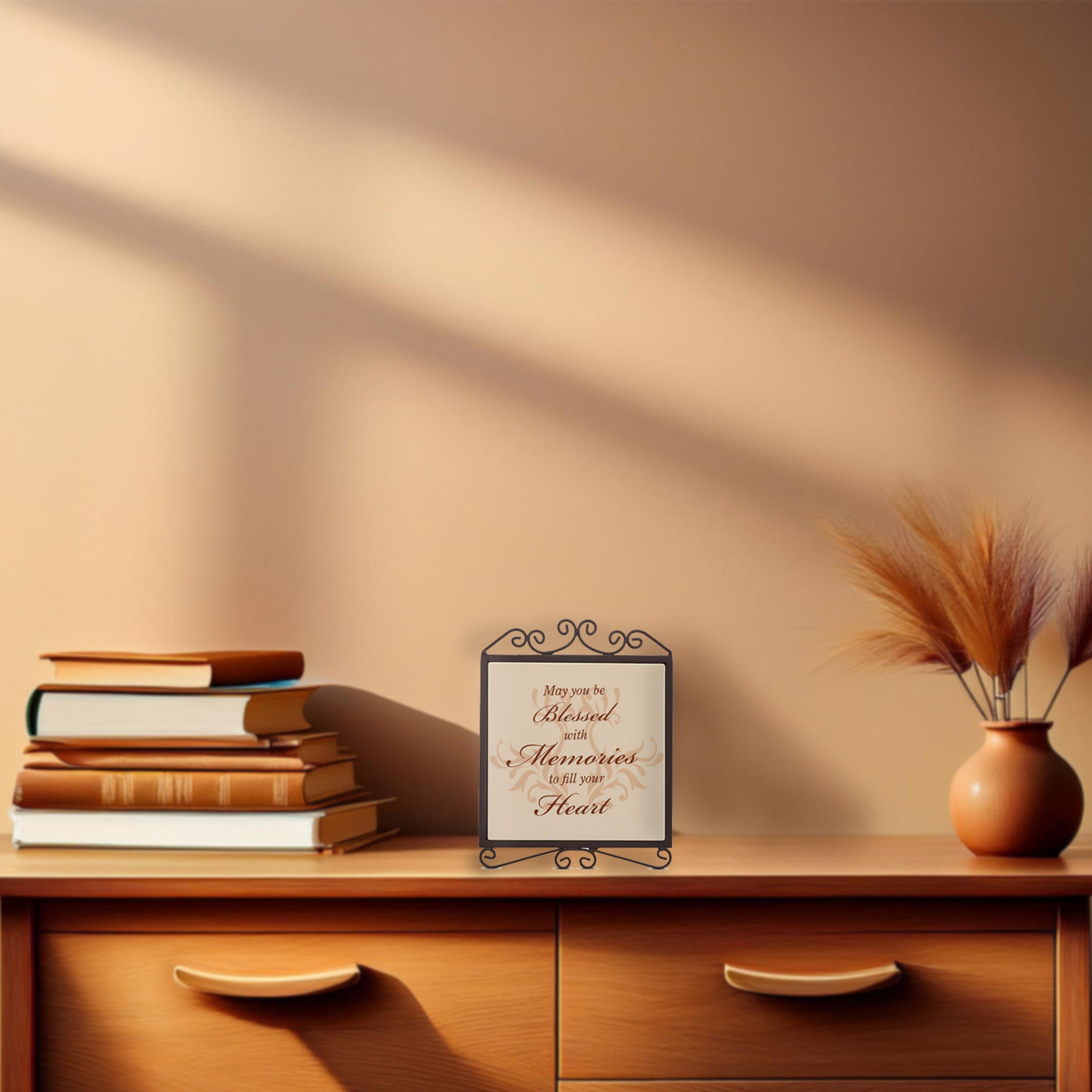 • IN-HOUSE DESIGN: This beautifully crafted plaque features a printed ceramic tile with a delicate floral background and elegant cursive script that reads: "May You Be Blessed with Memories to Fill Your Heart." The neutral cream-colored design is accented by the intricate scrollwork metal frame, which adds a touch of vintage-inspired charm. The versatile color palette complements any décor style.