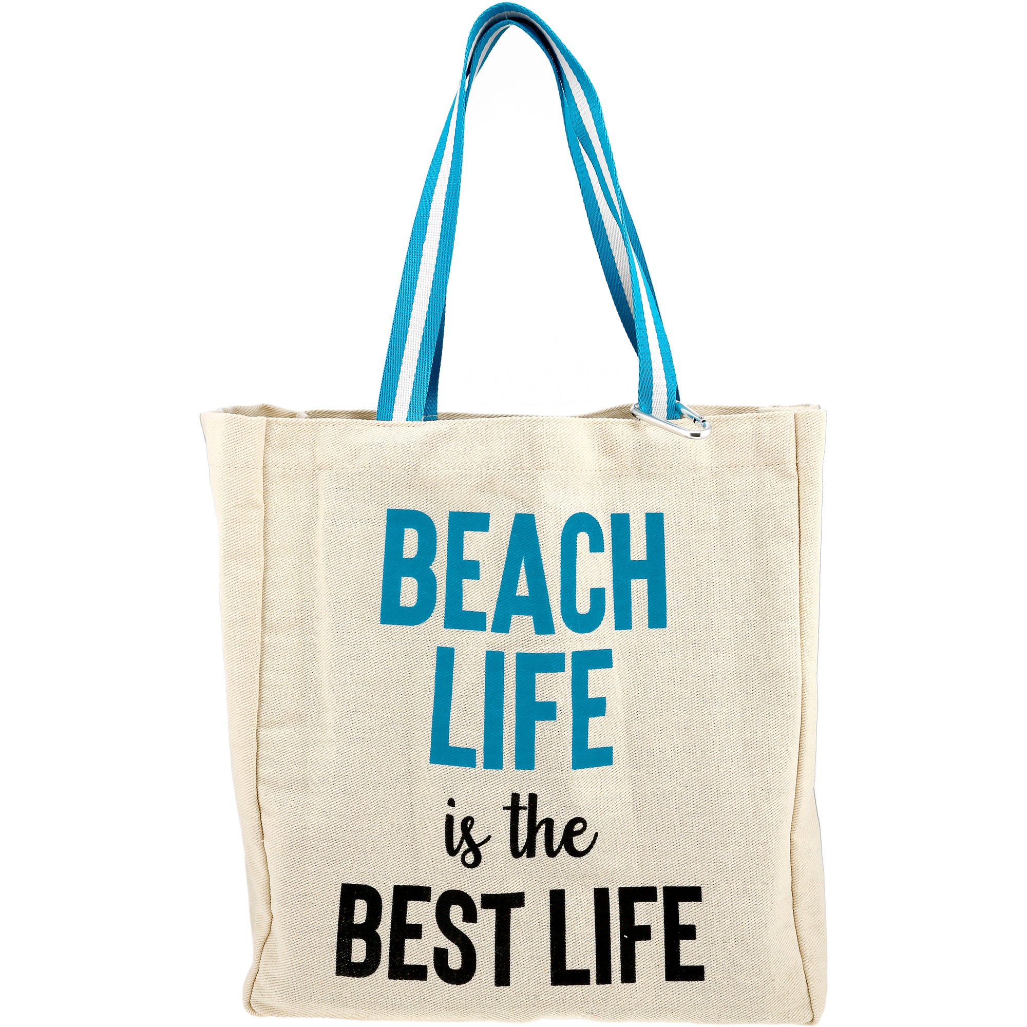 - IN-HOUSE DESIGN: "Beach Life Is The Best Life" blue & black text is printed onto one side of the cream/beige neutral-colored shopping bag. The thick blue and white double-handle straps can help held on your forearm or shoulder and support ~15 pounds of food/drinks. The clip is NOT meant to hold items inside while shopping in the store and clipped to the cart. These economical lightweight cloth bags were created by our in-house artists to bring a little humor to your shopping experience.