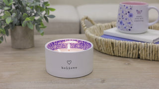 - IN-HOUSE DESIGN: The new & innovative candle offers a unique message for your loved one within the wax as time progresses. You will see a typewriter with an "Always Believe Something Amazing Is Going To Happen" sentiment after about 15 minutes. The entire decal with a double butterfly design will appear after 80 minutes as you watch. Then, the message will hide again and reappear with each burn. The front of the candles has a simplistic "Believe" decal accompanied by an overlapping double hand-drawn feel heart on a matte white exterior smooth-edged vessel with a glossy interior with walls that feature a blue background with white simplified floral designs.