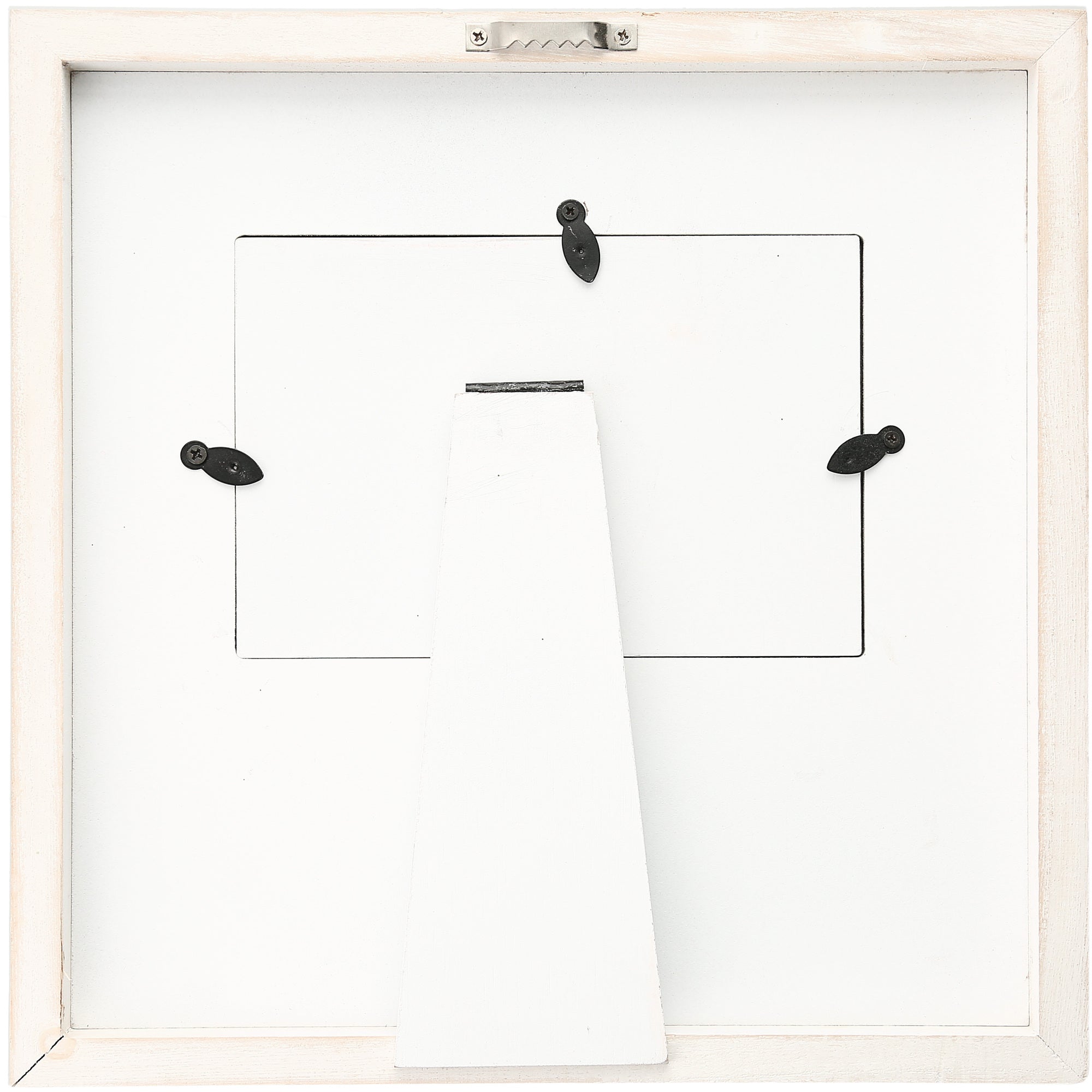 - PREMIUM QUALITY: The 10" white square outside frame is .75" wide and 1.5" thick. The next white beadboard background is 8.5" square and .75" thick. On top of that is a navy blue 7.25" square with a light gray 6.5" square inside with a .125" raised white border between. The rounded edge photo opening is 5.5" long & 3.5" tall with glass inside. The back side has a 6" long x 4" wide back with four .75" metal turn tabs, an MDF 6.25" x 2.5" easel back with an attached ribbon and a black metal hinge, as well as a silver metal hinge for wall hanging. The frame can also stand on its own edge.