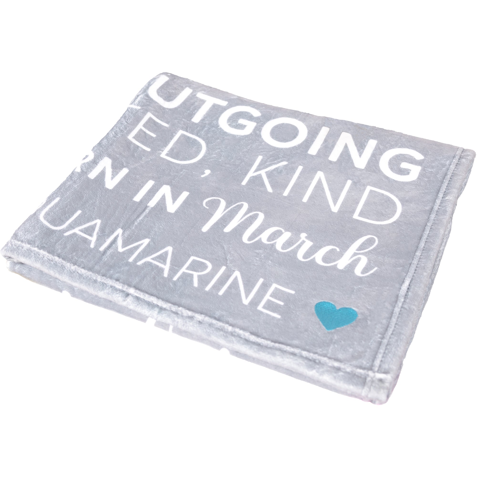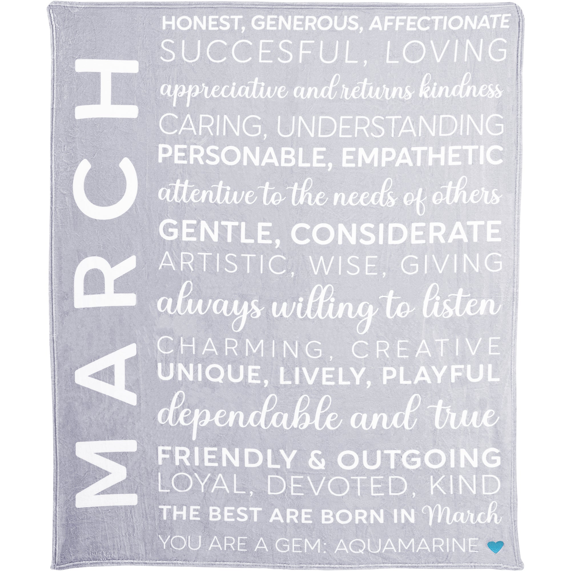 • IN-HOUSE DESIGN: The printed sentiment read "March" down the left side of the blanket along with an "Honest, Generous, Affectionate, Successful, Loving, Appreciative And Returns Kindness, Caring, Understanding, Personable, Empathetic, Attentive To The Needs Of Others, Gentle, Considerate, Artistic, Wise, Giving, Always Willing To Listen, Charming, Creative, Unique, Lively, Playful, Dependable And True, Friendly & Outgoing, Loyal, Devoted, Kind. The Best Are Born In March. You Are A Gem: Aquamarine" which consists of a san serif and cursive font combo. The blue heart in the bottom corner of the blanket is embroidered. The reverse side is white only.