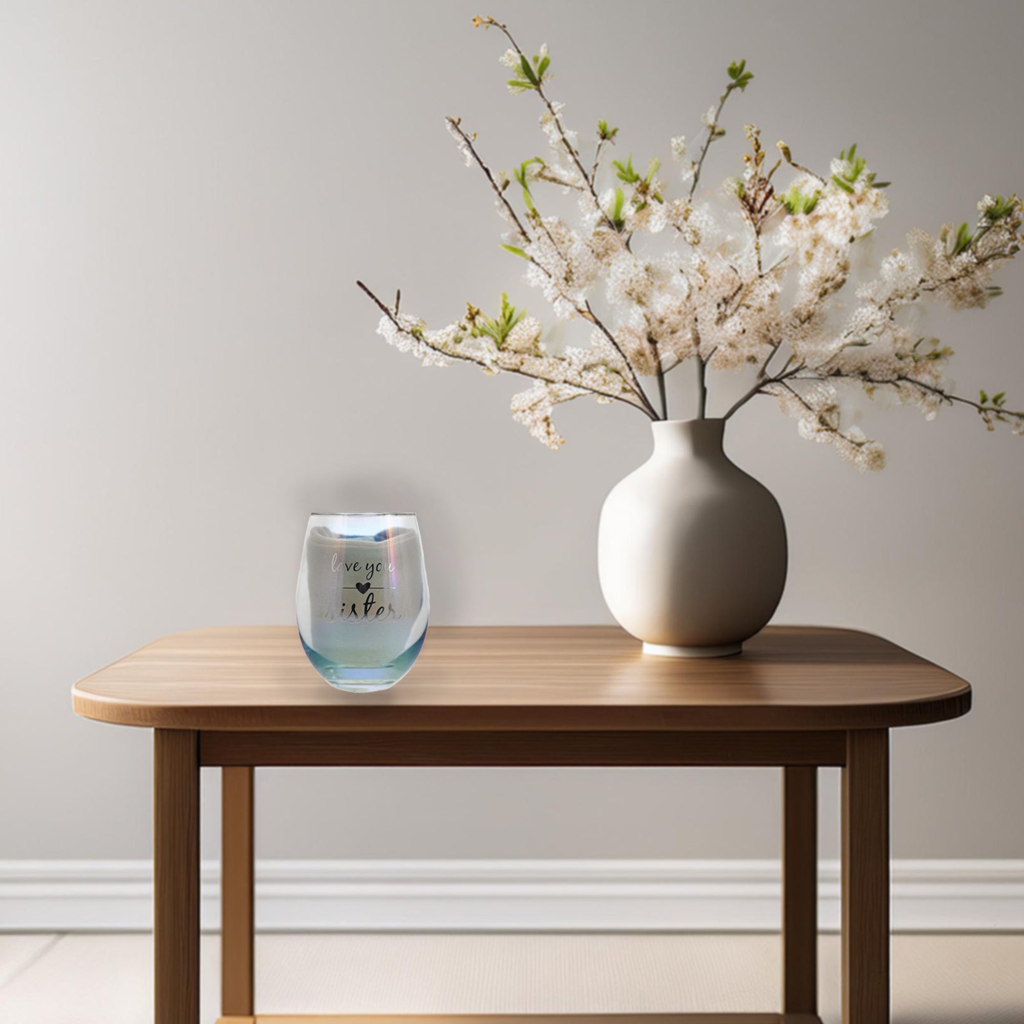 - IN-HOUSE DESIGN: The wine glass has an iridescent blue finish, an electroplated lip, and a “Love You Sister” sentiment with a line/heart underneath. The socks have a blue ankle, toe & heel with a cream body and a gray “Love You Sister” sentiment on the outer upper of the crew boot socks.