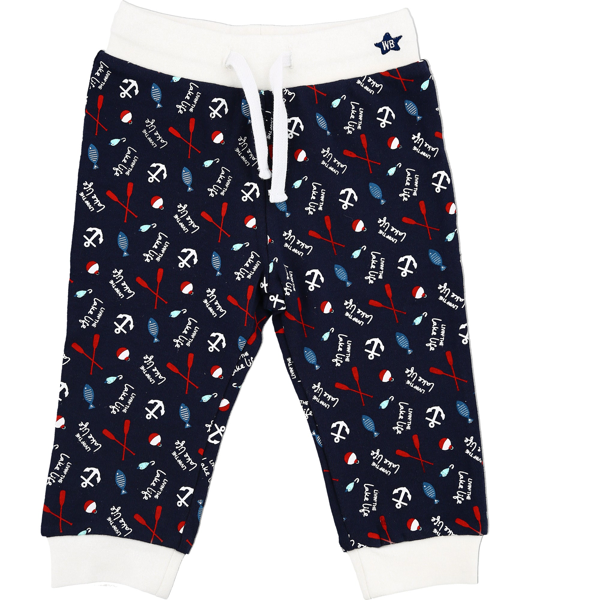 - IN-HOUSE DESIGN: The waistband has a star-shaped embroidered WB background. The white/red bobbers, blue fish hooks, white anchors, red oars, and blue fish patterns are accompanied by a repeating "Livin' The Lake Life" white sentiment.