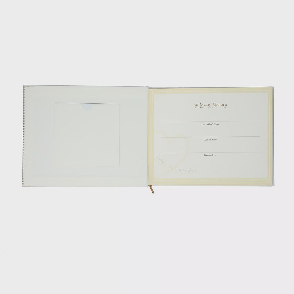 - PREMIUM QUALITY: 60-page memorial guest book, packaged in a printed box and polybag, is made from paper with a vegan leather cover, features a ribbon page marker, and fits a 4.25 x 4.25" photo.