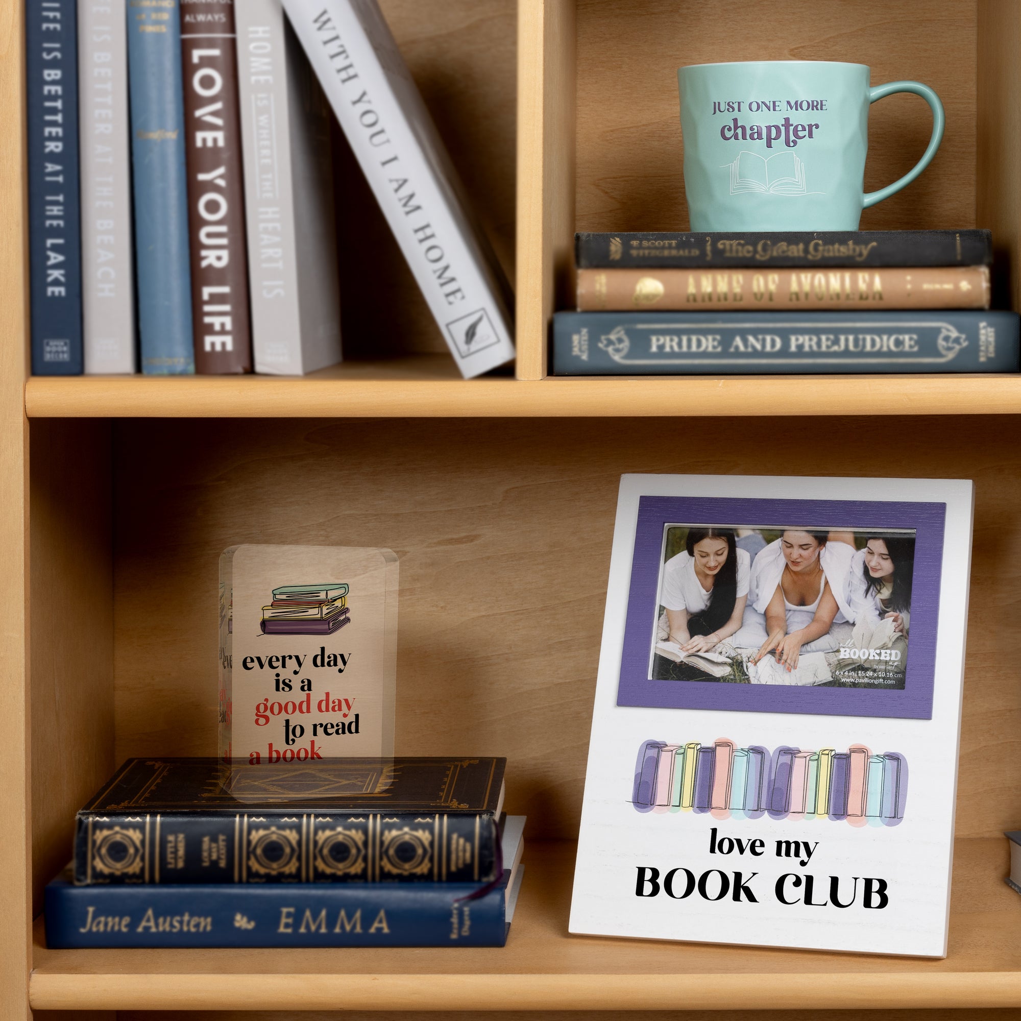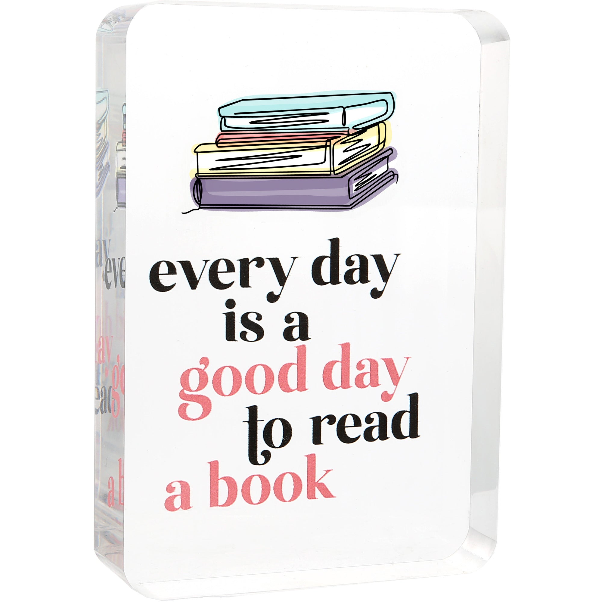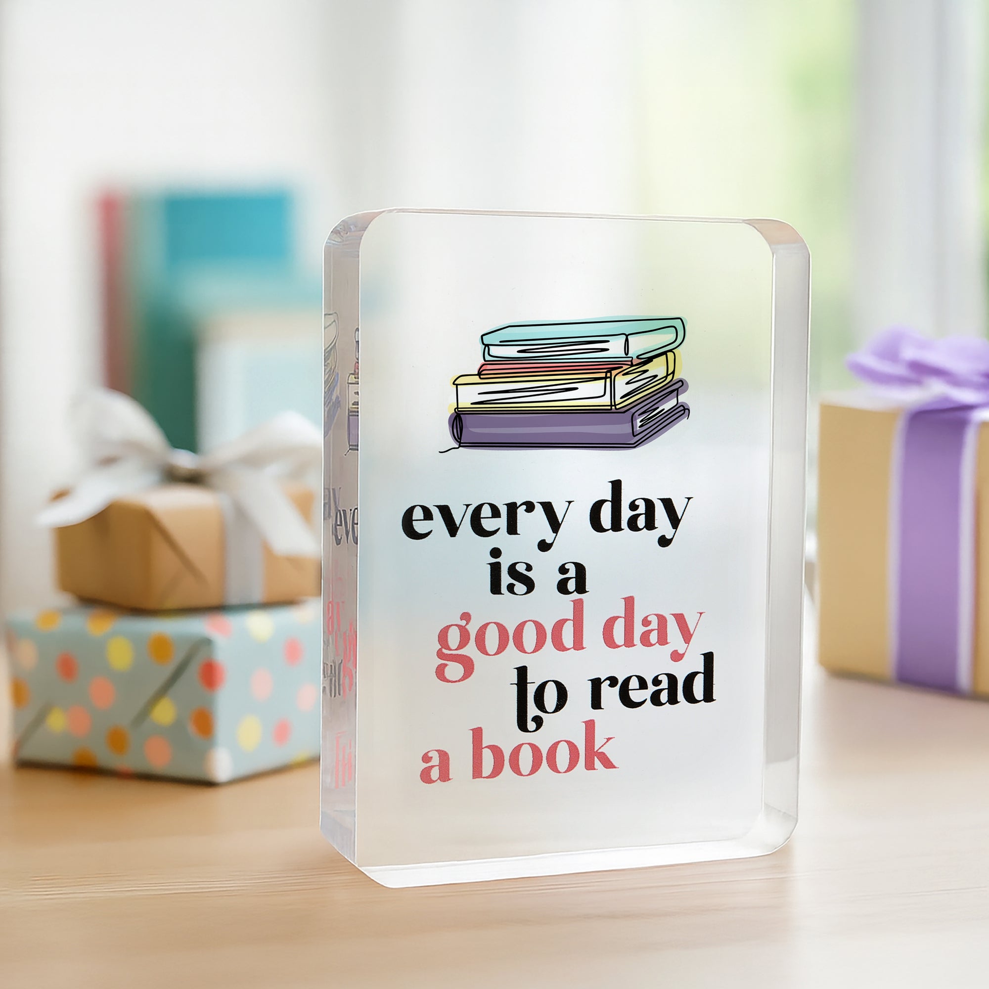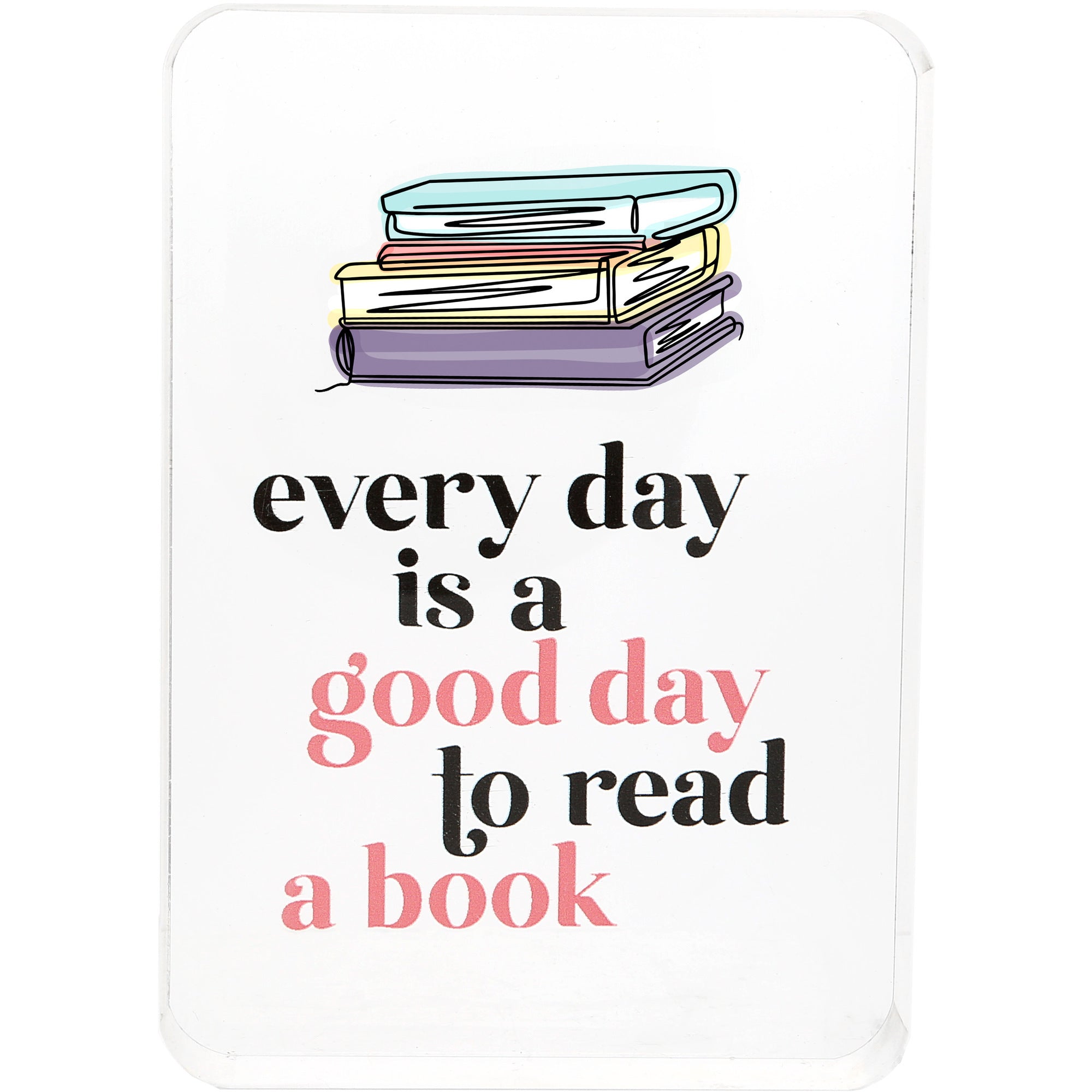 • IN-HOUSE DESIGN: The plaque features the uplifting message "Every day is a good day to read a book" in a stylish, modern font with a mix of black and coral text for a striking contrast. A charming illustration of a neatly stacked pile of colorful books below the text adds a playful touch, perfect for any book lover. The UV printing process provides a glossy, vivid finish that makes the design pop, enhancing its decorative appeal.