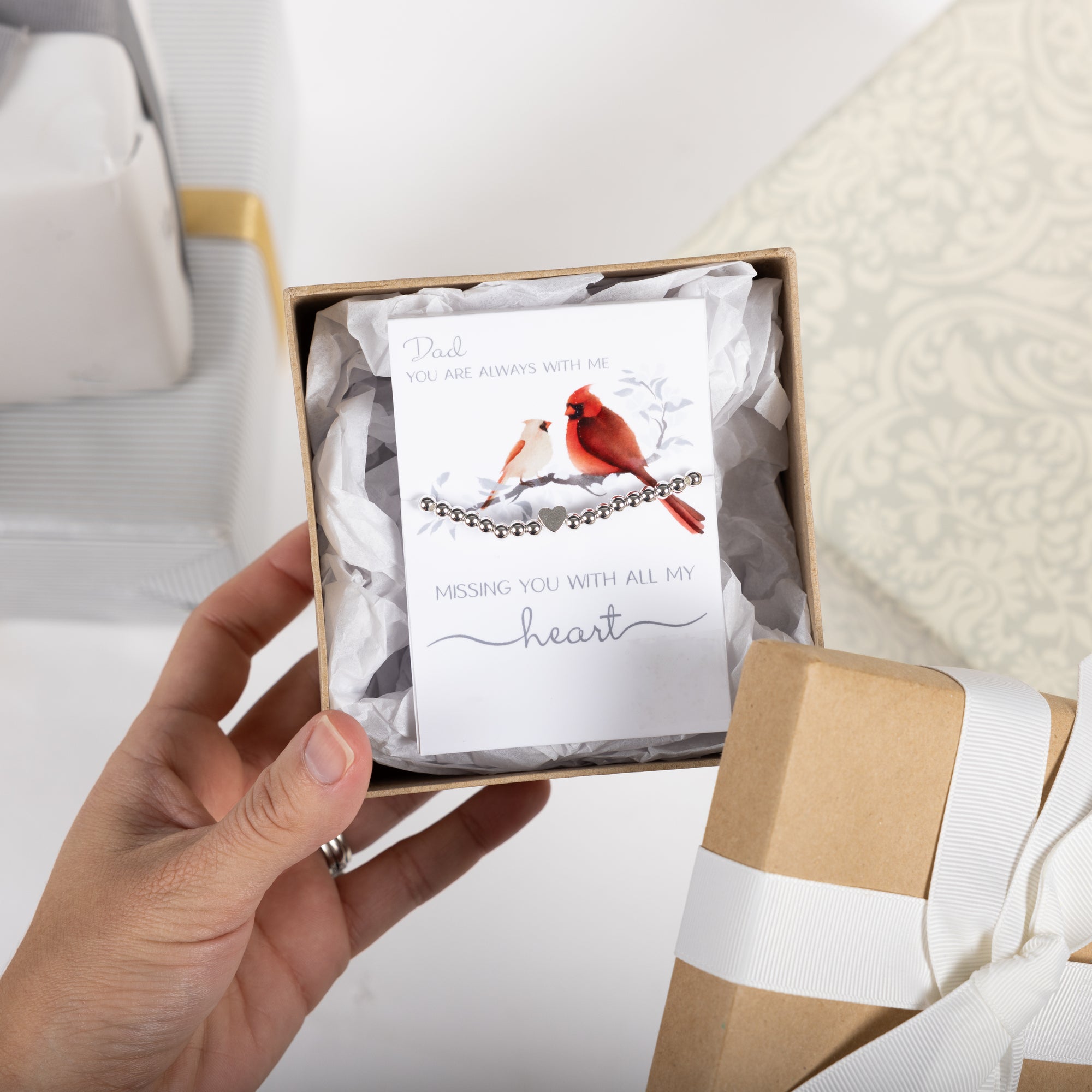 - IN-HOUSE DESIGN: The top and bottom of the gift packaging have a silver debossed sentiment, "Dad You Are Always With Me Missing You With All My Heart, " and printed cardinals on a tree branch image.