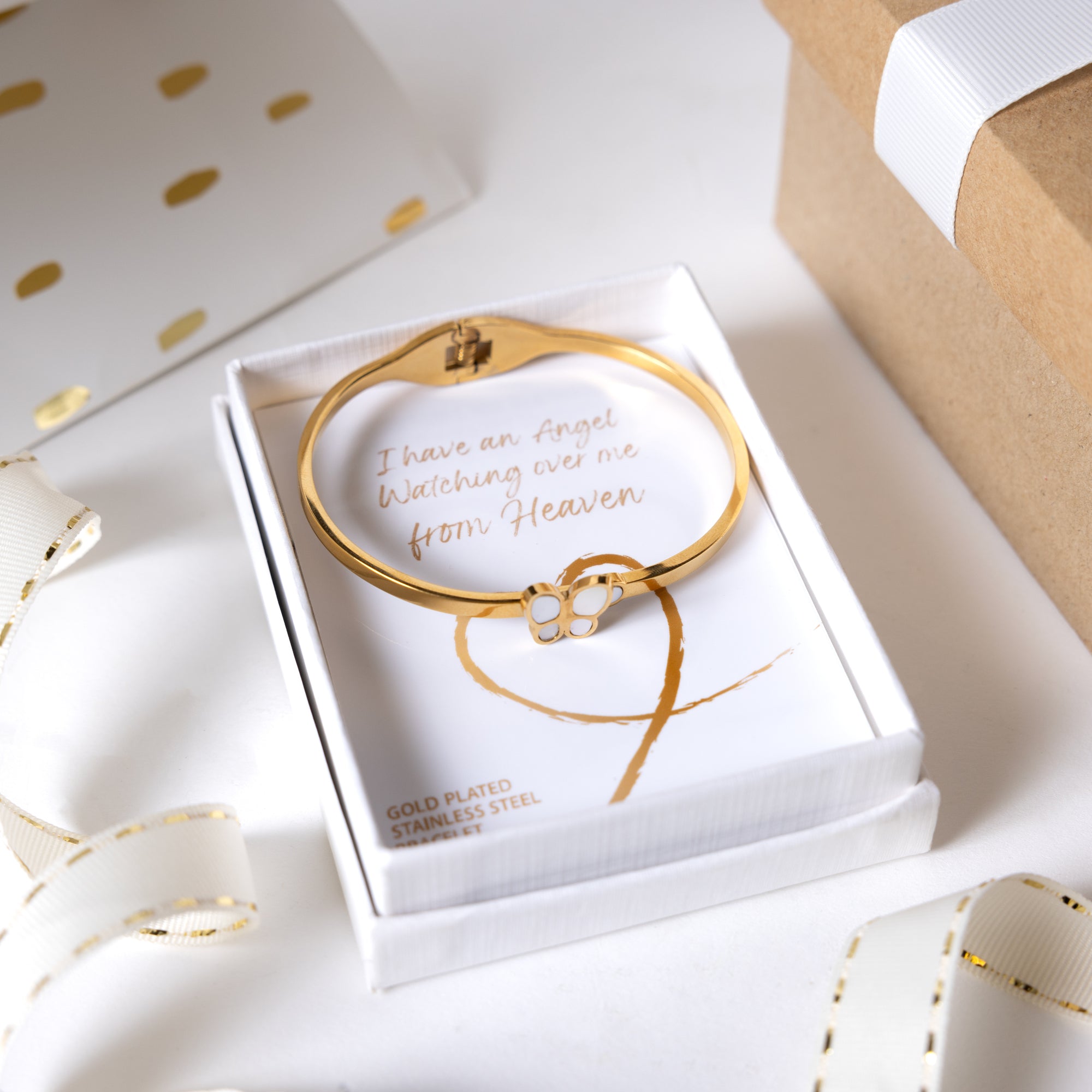 - PREMIUM QUALITY: This adult one-size-fits-most wrist-sized spring closure 18k gold plated stainless steel bracelet features a single opalescent shell pearl accented butterfly and circle. It is neatly placed in a closed gift box with a sentiment card.