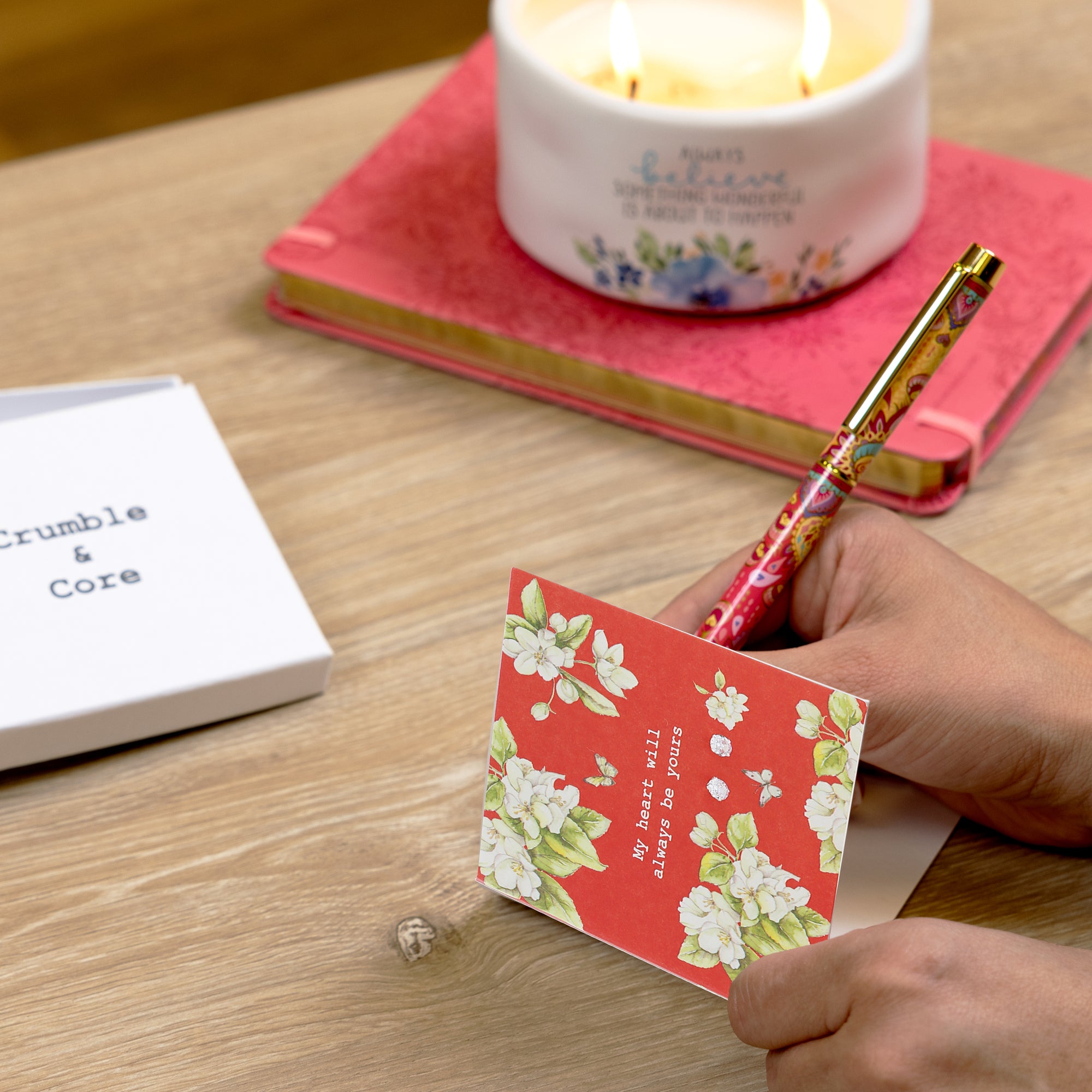 - IN-HOUSE DESIGN: The printed card has a red background and a beautiful magnolia floral and butterfly design. The earrings are strategically placed within the florals. The typewritten white "My Heart Will Always Be Yours" sentiment is placed in the center of the greeting card.