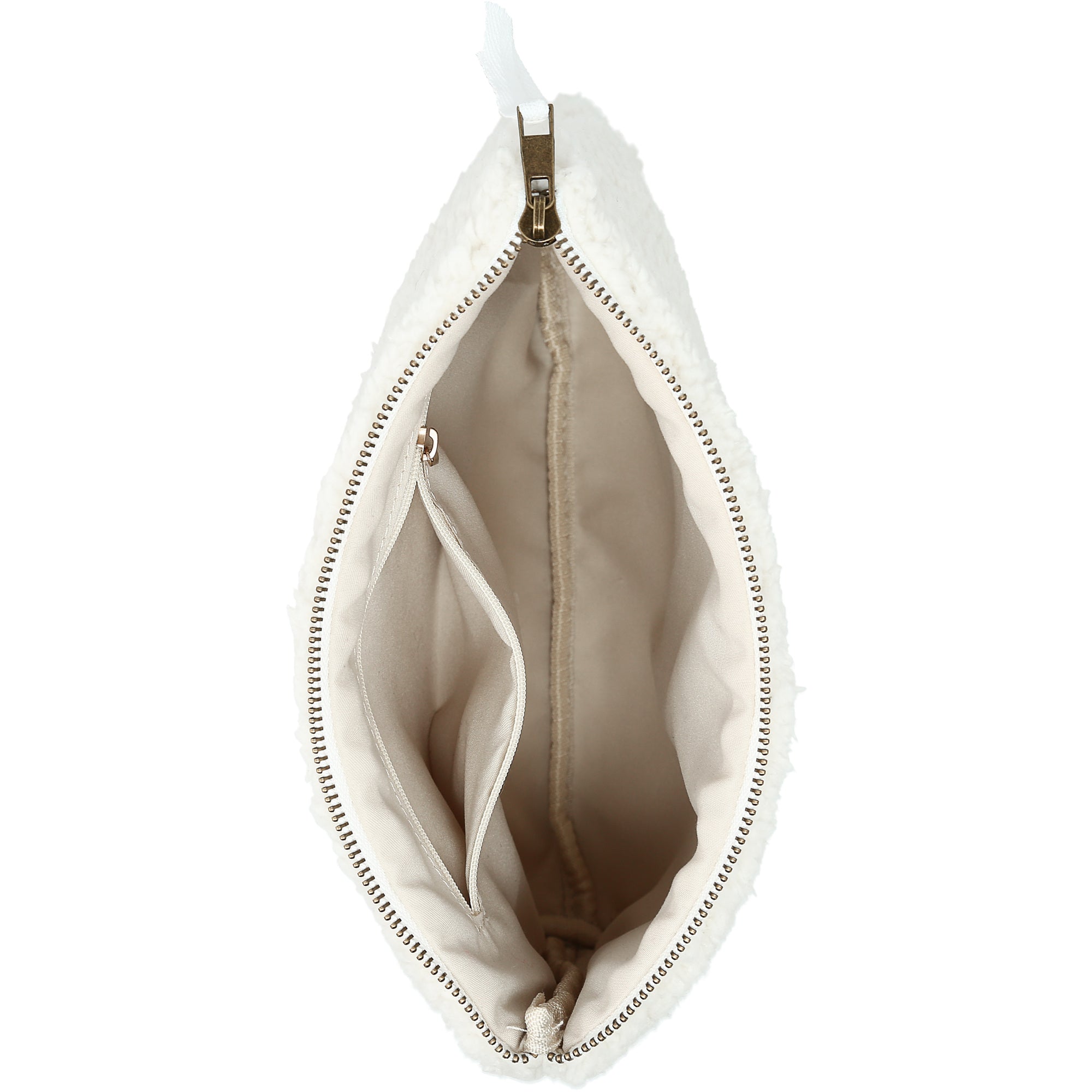 • PREMIUM QUALITY: 8" x 10" makeup bag is a 100% polyester cream sherpa exterior and a 100% cotton-lined cream interior. The zipper closures on both the single interior pocket and exterior top of the bag have bronze metal hardware. The front side of the travel case has a satin heart. Packaged in a plastic polybag with hangtag.