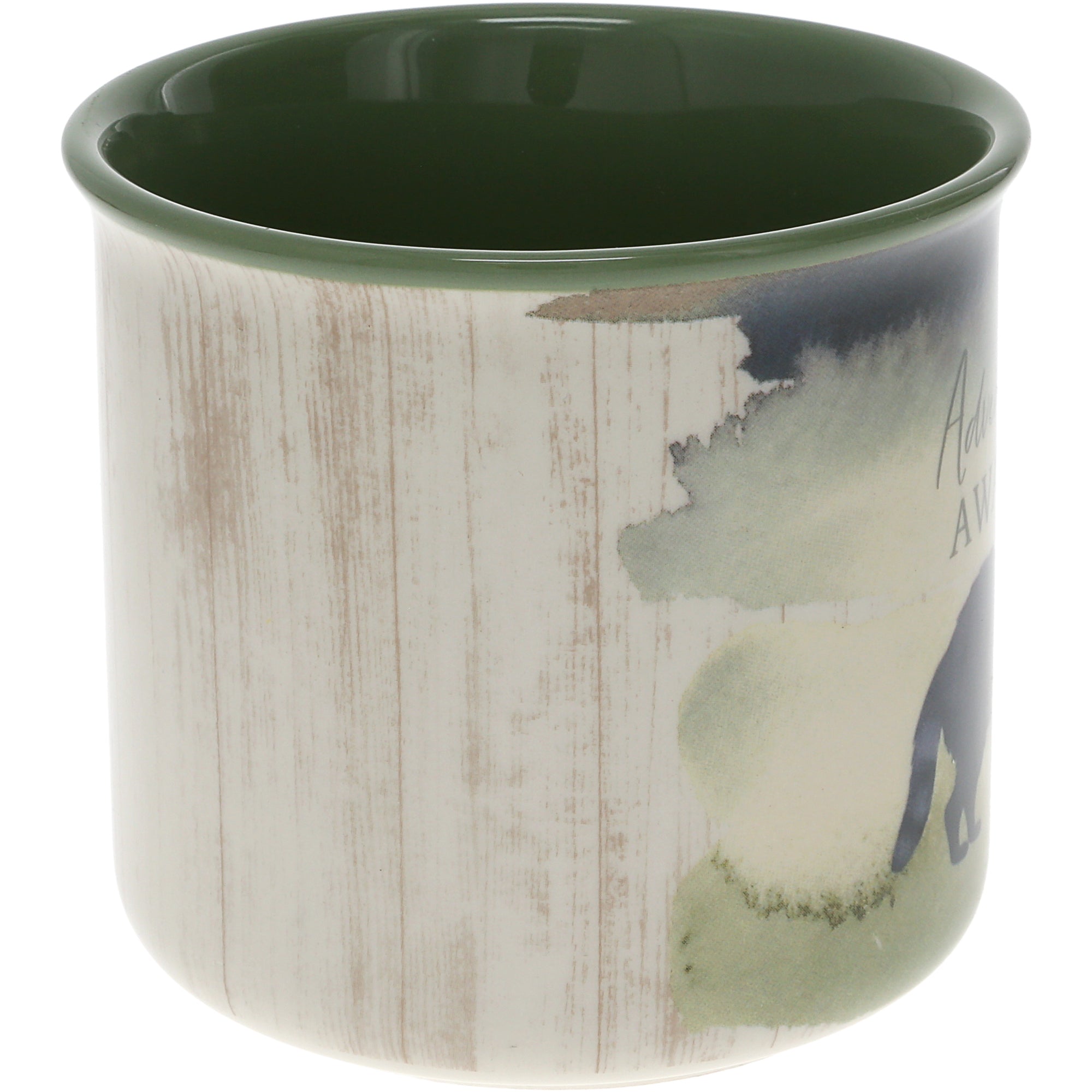 - IN-HOUSE DESIGN: Cream wood-printed wrap design wraps around the entirety of the vessel. In contrast, the front side has a gray, beige, and green watercolor finish with a gray raccoon accompanied by an "Adventure Awaits" sentiment. The handle and interior of the mug is an army green.