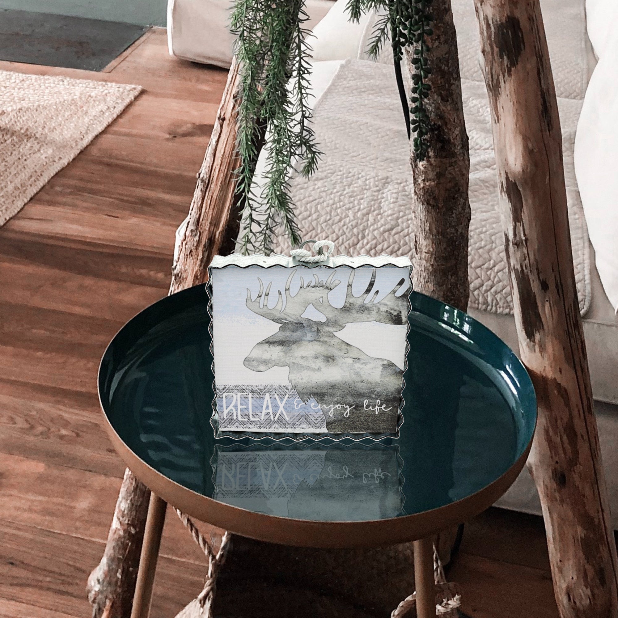 - IN-HOUSE DESIGN: Features a cream & blue-colored ombre background with a gray water-colored moose paired with a "Relax & Enjoy Life" sentiment and a gray chevron design.