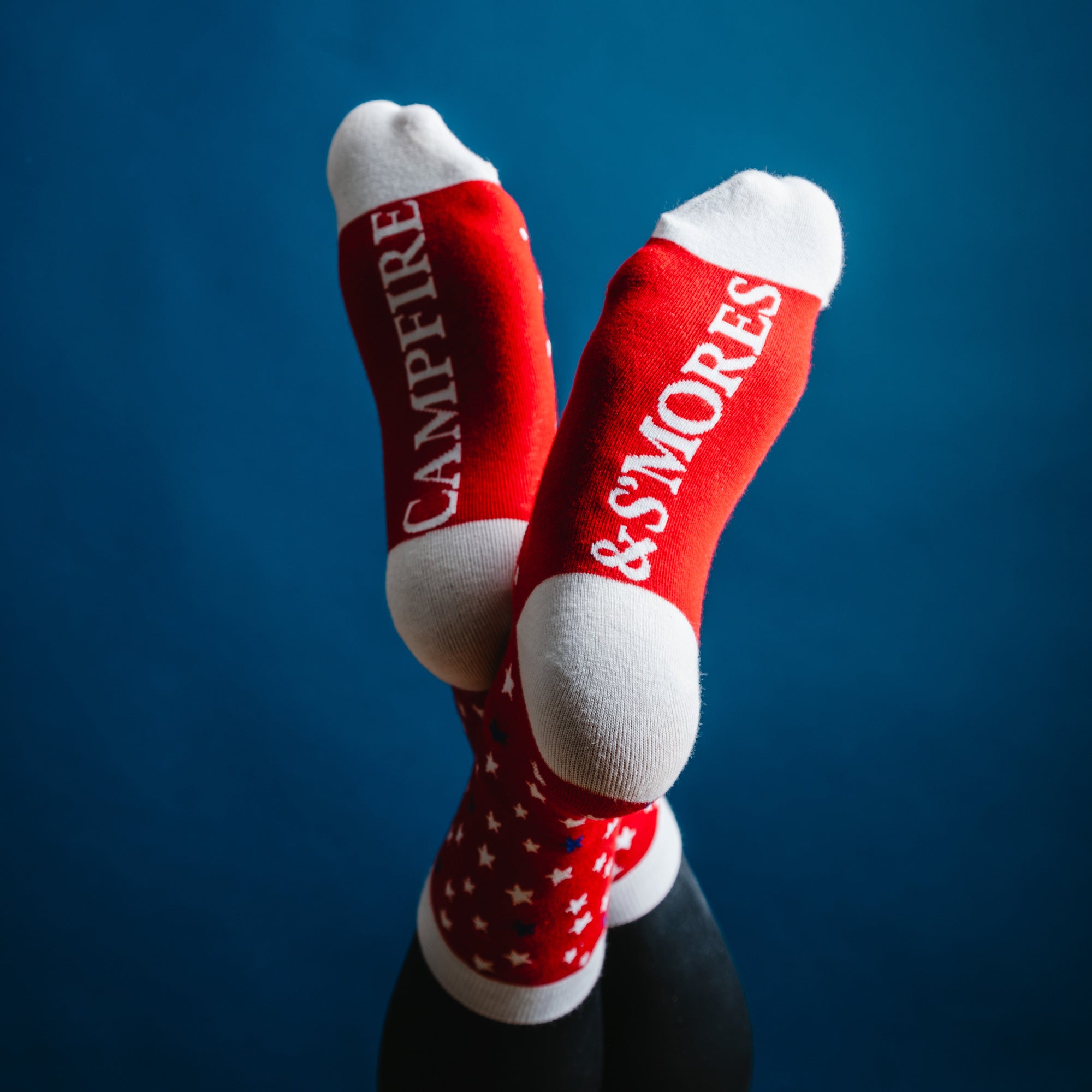 - IN-HOUSE DESIGN: Vibrant, patriotic-themed, and eye-catching socks feature a classic red, white, and blue color scheme with a charming star pattern. Designed for comfort and style, these socks are ankle-length with a white ankle, heel, and toe for a clean and polished look. Embrace the cozy nostalgia of campfires and s'mores with every step, as the sentiment "Campfire & Smores" graces the sole of these socks, igniting memories of cherished outdoor adventures and the joy of gathering around the flickering flames.