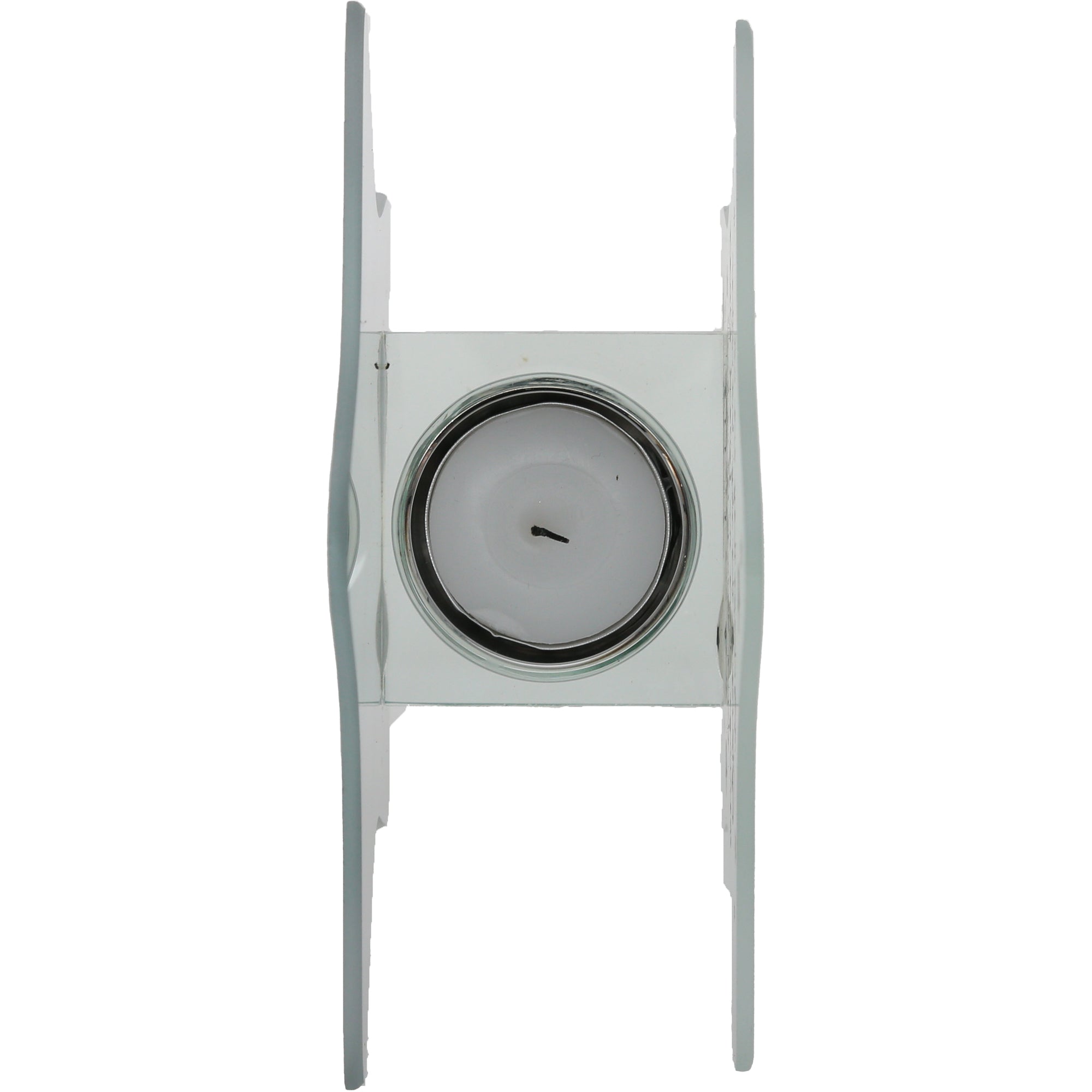 - PREMIUM QUALITY: 6" tall x 6" long x 2.25" wide star tree-shaped glass and mirror tealight candle holder has a glass front. The backing is completely mirrored. The connecting center mirrored plate has a round center that is 1.5" wide and has a .5" depth to hold one single wick 100% soy wax scent-free tealight candle which is included.