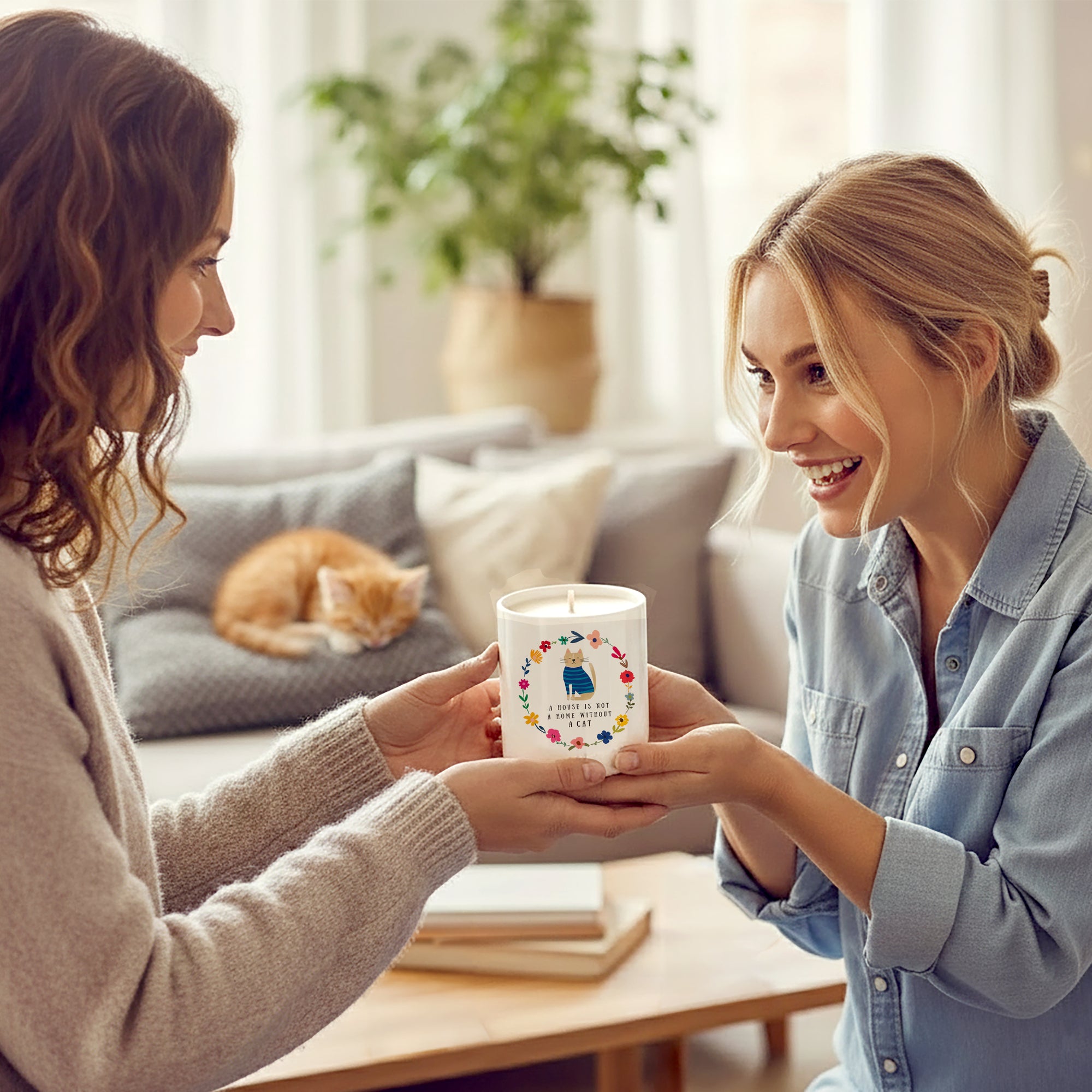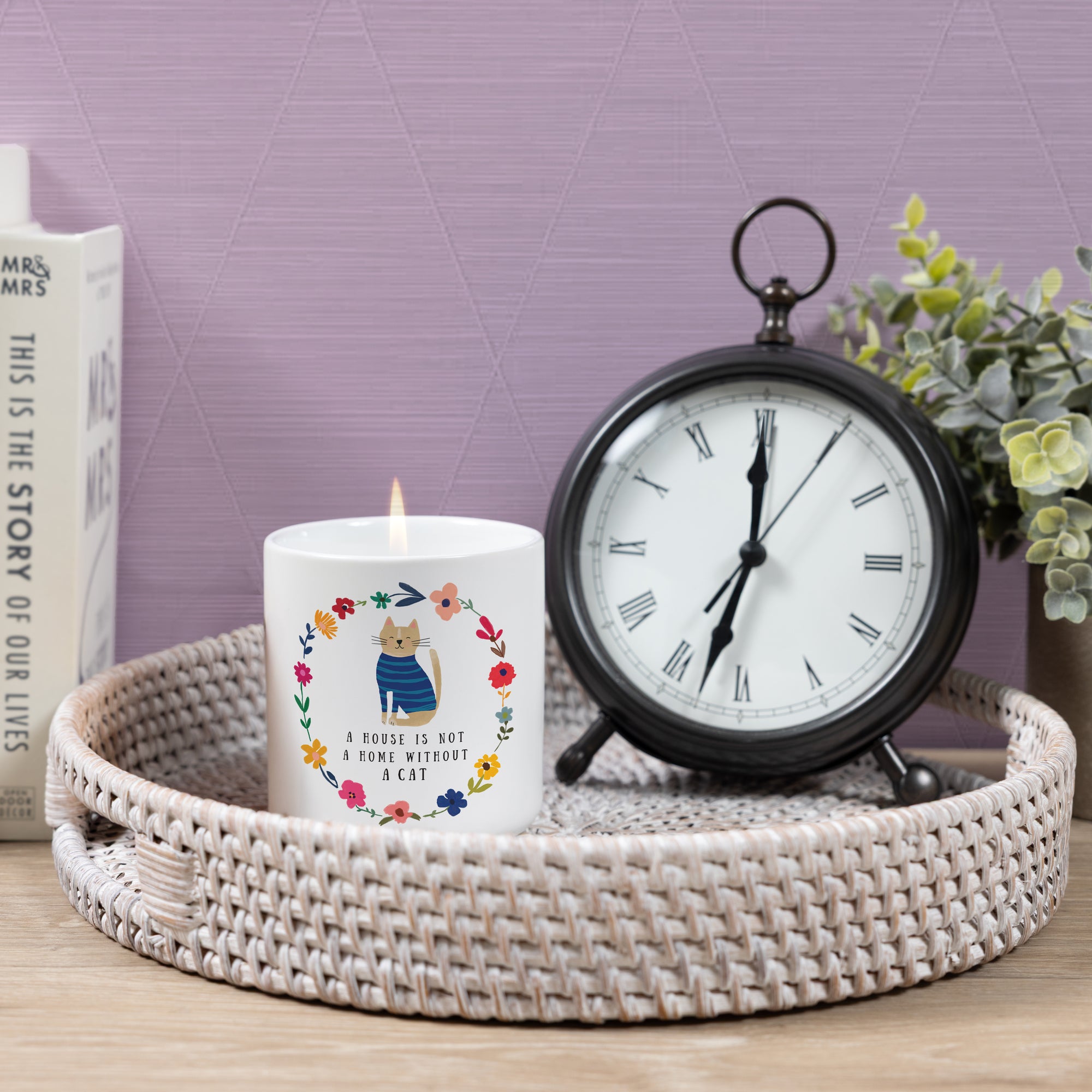- PREMIUM QUALITY: Crafted from sturdy white stoneware, this 3.25" x 3.5" candle vessel holds 8 oz of 100% soy wax and is designed to burn cleanly and evenly. The raised decal features a charming illustrated cat with a floral wreath, adding texture and visual appeal to any surface.