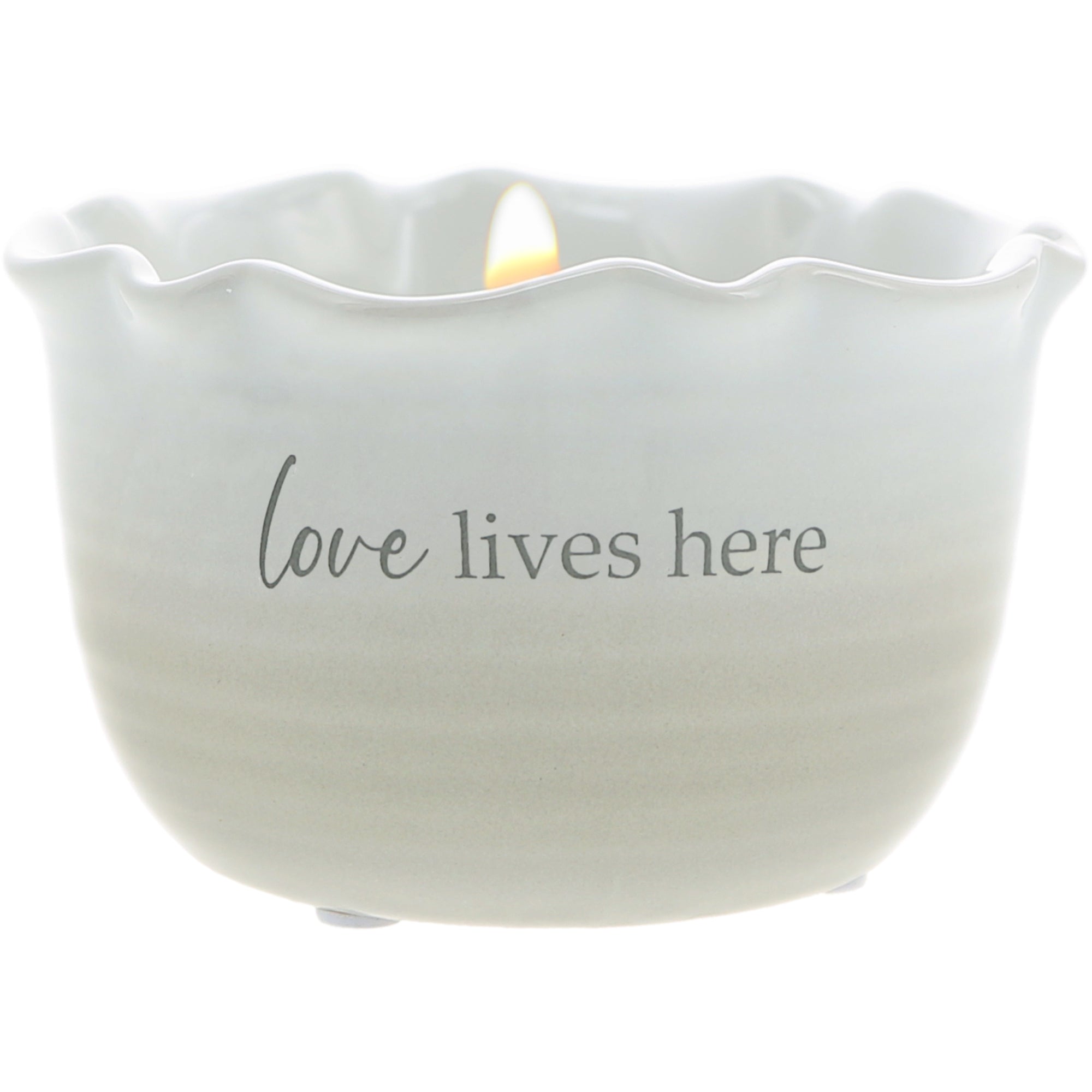- IN-HOUSE DESIGN: The new & innovative candle offers a unique message for your loved one within the wax as time progresses. You will see cursive written "Filled With Love" sentiment after about 10 minutes. As you watch, the entire decal will appear after 60 minutes. Then, the message will hide again and reappear with each burn. The front of the candles has a simplistic "Love Lives Here" decal accompanied by an ombre white & tan pattern.