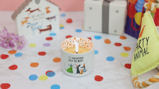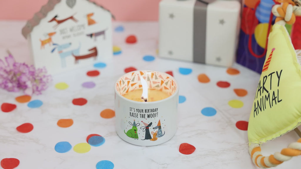 - IN-HOUSE DESIGN: Introducing our innovative candle that brings a delightful surprise to your loved one as time goes by. After approximately 10 minutes, a prancing poodle in a party hat with confetti and a "Wishing You Poodles Of Fun!" sentiment emerges from the wax, capturing your attention with their playful design. As the candle burns, the pattern gradually reveals itself after 60 minutes, creating a captivating visual experience. With each subsequent burn, the design disappears and reappears, adding an element of excitement to every lighting. The front of the candle features a charming celebratory decal, "It's Your Birthday Raise The Woof!" accompanied by four party hat dogs and confetti. The cylindrical vessel boasts a glossy white exterior, while the glossy white interior has a party hat and confetti pattern.