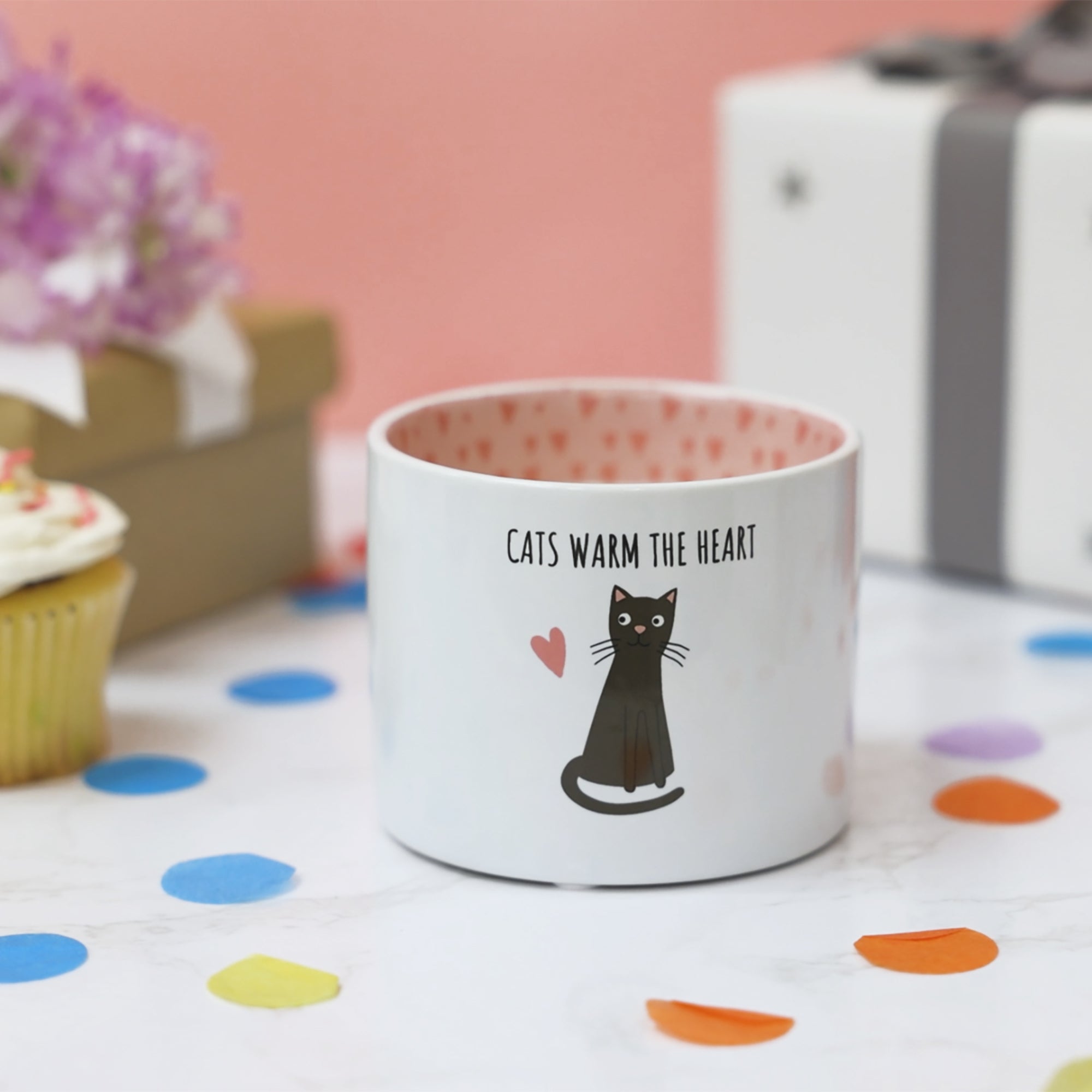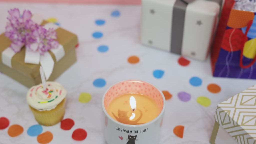 • IN-HOUSE DESIGN: Introducing our innovative candle that brings a delightful surprise to your loved one as time goes by. After approximately 10 minutes, a smiling and leaping gray cat, surrounded by pink hearts, emerges from the wax, capturing your attention with their playful design. As the candle burns, the pattern gradually reveals itself after 60 minutes, creating a captivating visual experience. With each subsequent burn, the design disappears and reappears, adding an element of excitement to every lighting. The front of the candle features a charming celebratory decal, "Cats Warm The Heart" accompanied by a pink heart and gray cat. The cylindrical vessel boasts a glossy white exterior, while the glossy pink interior has a varying-sized heart pattern.