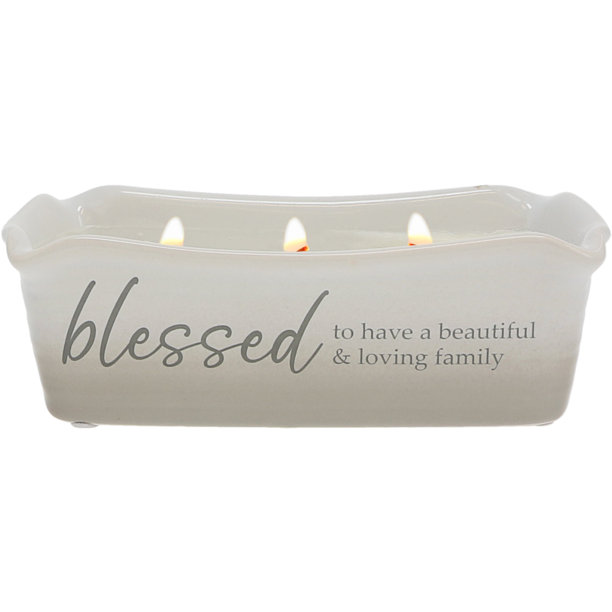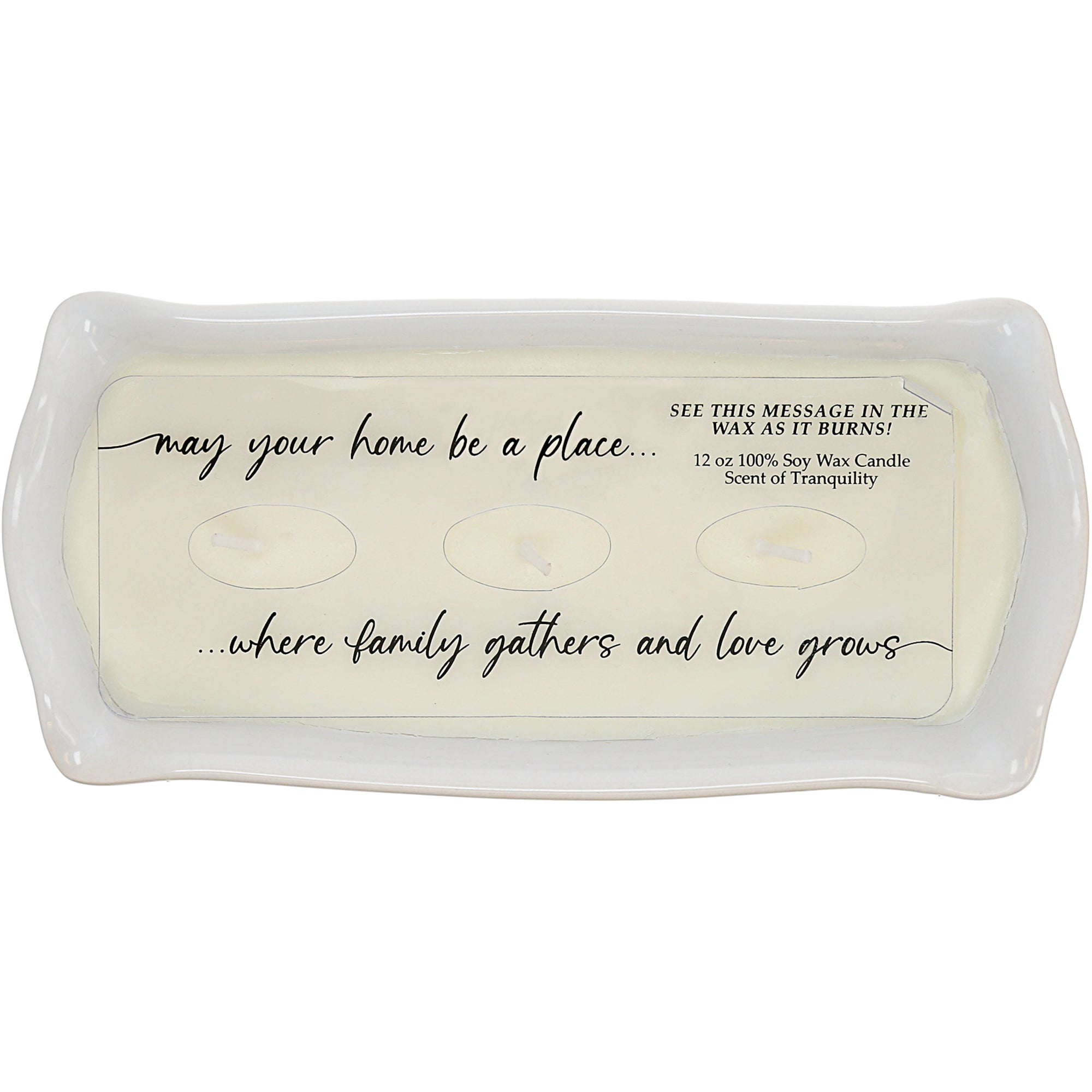 - IN-HOUSE DESIGN: The new & innovative candle offers a unique message for your loved one within the wax as time progresses. You will see cursive written "May Your Home Be A Place Where Family Gathers And Love Grows" sentiment after about 10 minutes. As you watch, the entire decal will appear after 60 minutes. Then, the message will hide again and reappear with each burn. The front of the candles has a simplistic "Blessed To Have A Beautiful & Loving Family" decal accompanied by an ombre white & tan pattern.