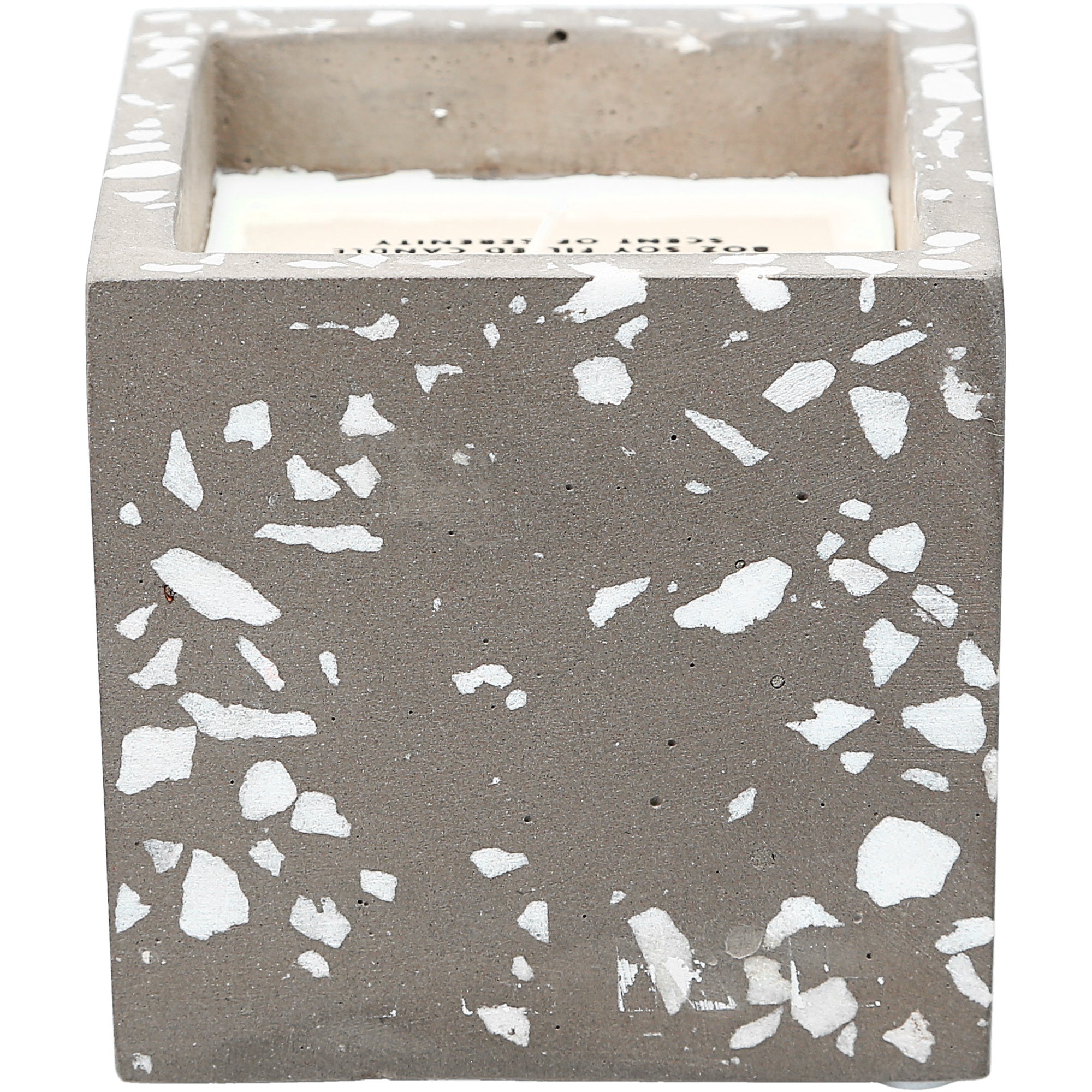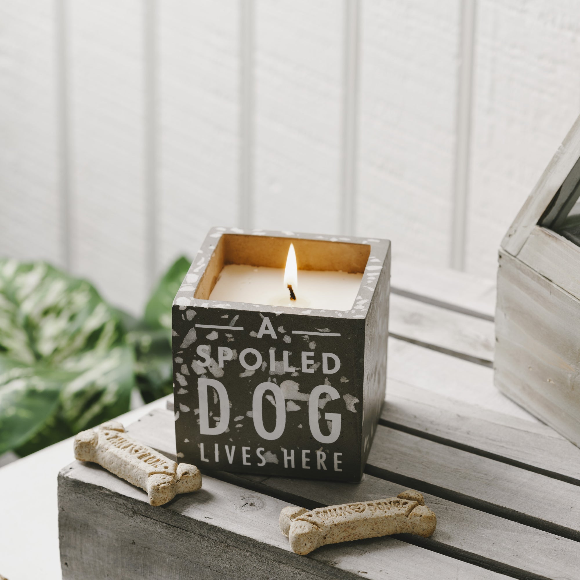 - IN-HOUSE DESIGN: Gray square candle with a white speckled pattern is accompanied by "A Spoiled Dog Lives Here" glossy white sentiment on the front side. The artwork was created with simplistic neutral tones to fit into any home.